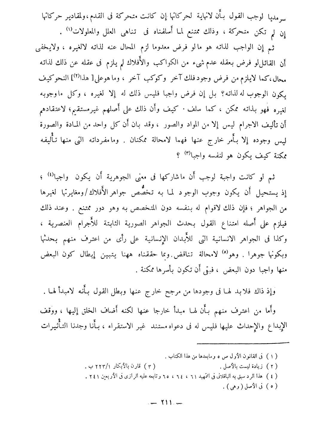 ثمَّ لَو كَانَت وَاجِبَة لوَجَبَ ان مَا شاركها فِي معنى الجوهرية أَن يكون وَاجِبا إِذْ يَسْتَحِيل أَن يكون وجوب الْوُجُود لما بِهِ تخصص جَوَاهِر الأفلاك ومغايرتها لغَيْرهَا من الْجَوَاهِر فَإِن ذَلِك لَا قوام لَهُ بِنَفسِهِ دون المتخصص بِهِ وَهُوَ دور مُمْتَنع وَعند ذَلِك فَيلْزم على أَصله امْتنَاع القَوْل بِحَدَث الْجَوَاهِر الصورية الثَّابِتَة للأجرام العنصرية وَكَذَا فِي الْجَوَاهِر الانسانية الَّتِى للأبدان الإنسانية على رأى من اعْترف مِنْهُم بحدثها وبكونها جوهرا وَهُوَ لَا محَالة تنَاقض وَبِمَا حققناه هَهُنَا يتَبَيَّن إبِْطَال كَون الْبَعْض مِنْهَا وَاجِبا دون الْبَعْض فبقى أَن تكون بأسرها مُمكنَة