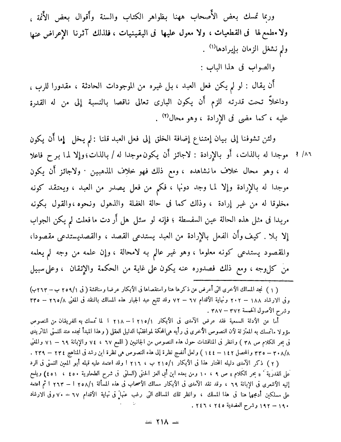 وَلَئِن تشوفنا إِلَى بَيَان إمتناع إِضَافَة الْخلق إِلَى فعل العَبْد قُلْنَا لم يخل إِمَّا أَن يكون موجدا لَهُ بِالذَّاتِ أَو بالإرادة لَا جَائِز أَن يكون موجدا لَهُ بِالذَّاتِ وَإِلَّا لما برح فَاعِلا لَهُ وَهُوَ محَال خلاف مَا نشاهده وَمَعَ ذَلِك فَهُوَ خلاف المذهبين وَلَا جَائِز أَن يكون موجدا لَهُ بالإرادة وَإِلَّا لما وجد دونهَا فكم من فعل يصدر من العَبْد ويعتقد كَونه مخلوقا لَهُ من غير إِرَادَة وَذَلِكَ كَمَا فِي حَالَة الْغَفْلَة والذهول وَنَحْوه وَالْقَوْل بِكَوْنِهِ مرِيدا فِي مثل هَذِه الْحَالة عين السفسطة فَإِنَّهُ لَو سُئِلَ هَل أردْت مَا فعلت لم يكن الْجَواب إِلَّا بِلَا كَيفَ وَأَن الْفِعْل بالإرادة من العَبْد يستدعى الْقَصْد وَالْقَصْد يستدعى مَقْصُودا وَالْمَقْصُود يستدعى كَونه مَعْلُوما وَهُوَ غير عَالم بِهِ لَا محَالة وَإِن علمه من وَجه لم يُعلمهُ من كل وَجه وَمَعَ ذَلِك فصدوره عَنهُ يكون على غَايَة من الْحِكْمَة والإتقان وعَلى سَبِيل