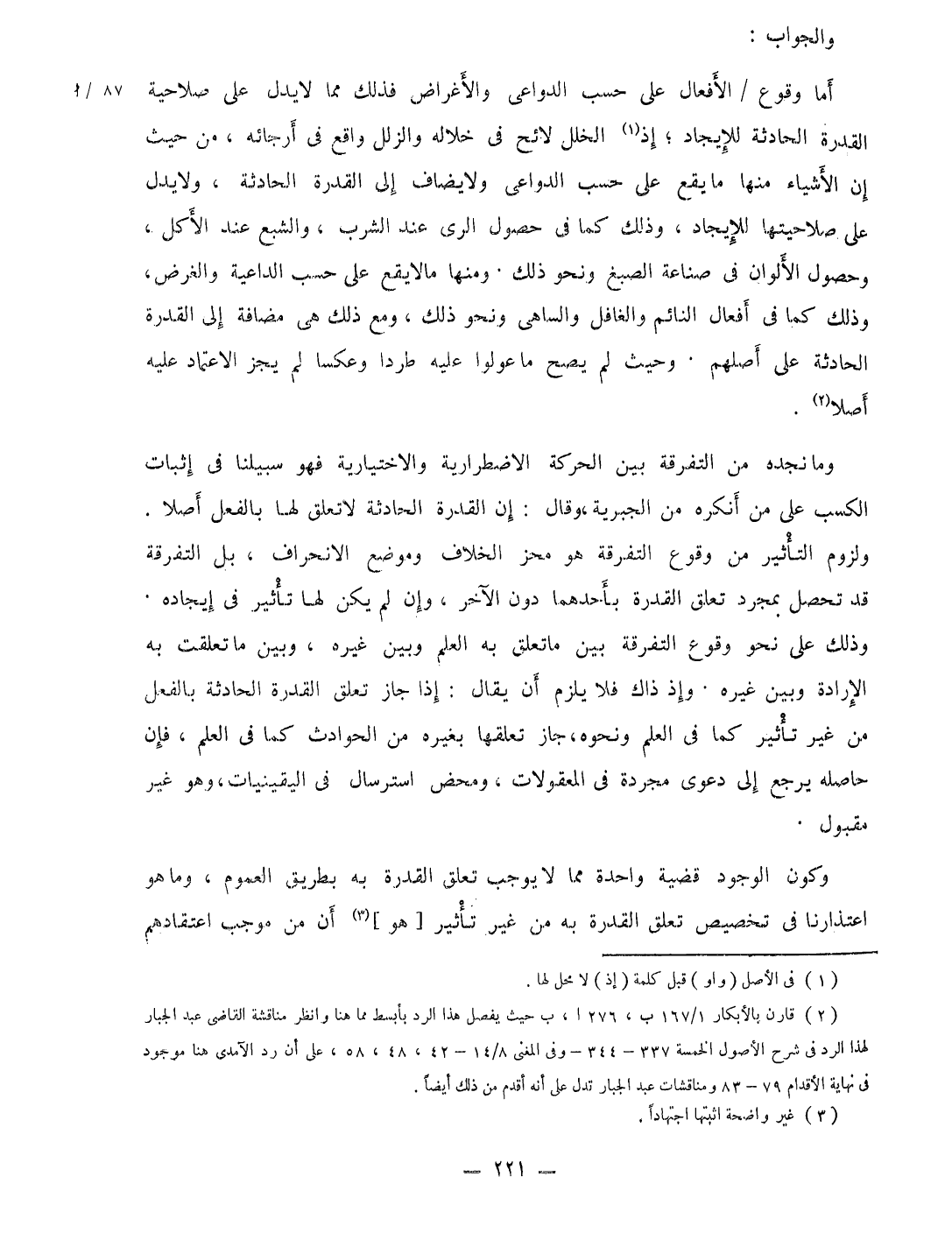 أما وُقُوع الْأَفْعَال على حسب الدواعى والأغراض فَذَلِك مِمَّا لَا يدل على صَلَاحِية الْقُدْرَة الْحَادِثَة للإيجاد إِذْ الْخلَل لائح فِي خلاله والزلل وَاقع فى أرجائه من حَيْثُ إِن الْأَشْيَاء مِنْهَا مَا يَقع على حسب الدواعى وَلَا يُضَاف إِلَى الْقُدْرَة الْحَادِثَة وَلَا يدل على صلاحيتها للإيجاد وَذَلِكَ كَمَا فى حُصُول الرى عِنْد الشّرْب والشبع عِنْد الْأكل وَحُصُول الألوان فِي صناعَة الصَّبْغ وَنَحْو ذَلِك وَمِنْهَا مَا لَا يَقع على حسب الداعية وَالْغَرَض وَذَلِكَ كَمَا فِي أَفعَال النَّائِم والغافل والساهى وَنَحْو ذَلِك وَمَعَ ذَلِك هى مُضَافَة إِلَى الْقُدْرَة الْحَادِثَة على أصلهم وَحَيْثُ لم يَصح مَا عولوا عَلَيْهِ طردا وعكسا لم يجز الِاعْتِمَاد عَلَيْهِ أصلا