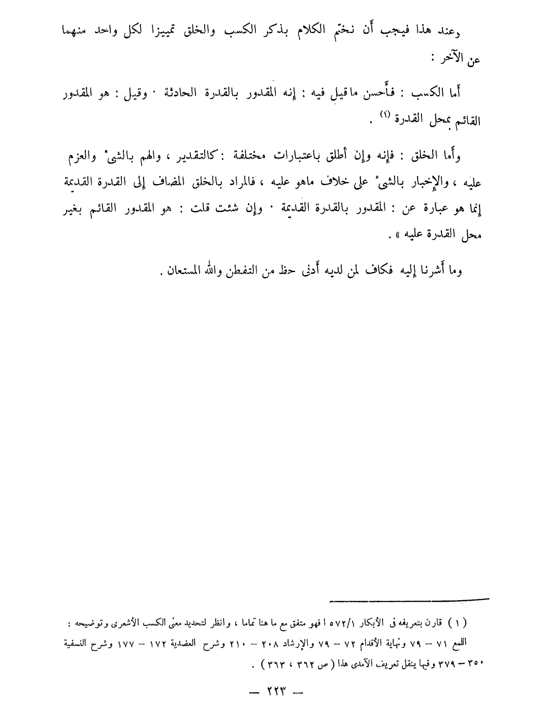 وَعند هَذَا فَيجب أَن نختم الْكَلَام بِذكر الْكسْب والخلق تمييزا لكل وَاحِد مِنْهُمَا عَن الآخر