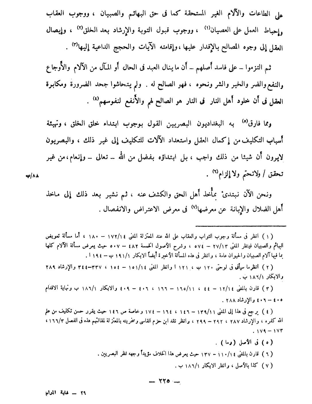 ثمَّ التزموا على فَاسد أصلهم أَن مَا ينَال العَبْد فِي الْحَال أَو الْمَآل من الآلام والأوجاع والنفع والضر وَالْخَيْر وَالشَّر وَنَحْوه فَهُوَ الصَّالح لَهُ وَلم يتحاشوا جحد الضَّرُورَة ومكابرة الْعقل فِي أَن خُلُود أهل النَّار فِي النَّار هُوَ الصَّالح لَهُم والأنفع لنفوسهم
