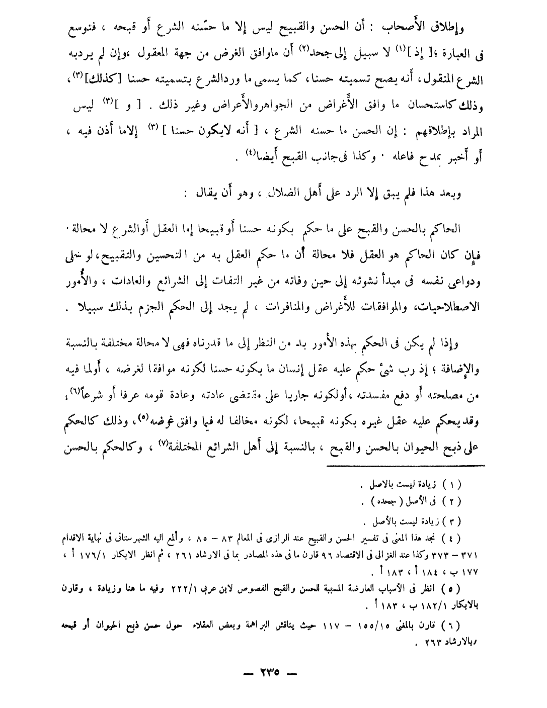 وَإِذا لم يكن فِي الحكم بِهَذِهِ الْأُمُور بُد من النّظر إِلَى مَا قدرناه فهى لَا محَالة مُخْتَلفَة بِالنِّسْبَةِ وَالْإِضَافَة إِذْ رب شئ حكم عَلَيْهِ عقل إِنْسَان مَا بِكَوْنِهِ حسنا لكَونه مُوَافقا لغرضه أَو لما فِيهِ من مصْلحَته أَو دفع مفسدته أَو لكَونه جَارِيا على مُقْتَضى عَادَته وَعَادَة قومه عرفا أَو شرعا وَقد يحكم عَلَيْهِ عقل غَيره بِكَوْنِهِ قبيحا لكَونه مُخَالفا لَهُ فِيمَا وَافق غَرَضه وَذَلِكَ كَالْحكمِ على ذبح الْحَيَوَان بالْحسنِ والقبح بِالنِّسْبَةِ إِلَى أهل الشَّرَائِع الْمُخْتَلفَة وكالحكم بالْحسنِ