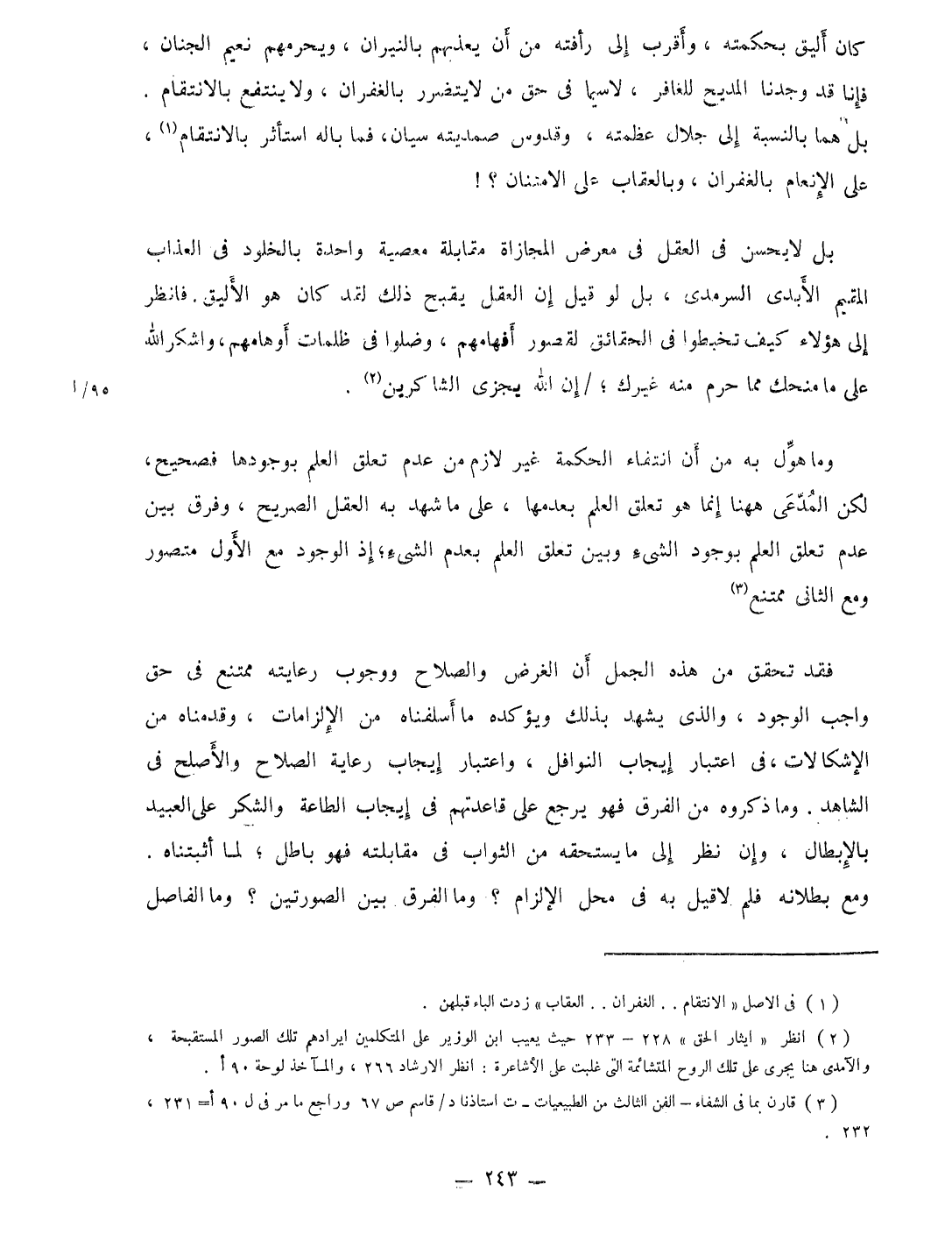 بل لَا يحسن فِي الْعقل فِي معرض المجازاة مُقَابلَة مَعْصِيّة وَاحِدَة بالخلود فِي الْعَذَاب الْمُقِيم الأبدى السرمدى بل لَو قيل إِن الْعقل يقبح ذَلِك لقد كَانَ هُوَ الْأَلْيَق فَانْظُر إِلَى هَؤُلَاءِ كَيفَ تخبطوا فِي الْحَقَائِق لقُصُور أفهامهم وَضَلُّوا فِي ظلمات أوهامهم واشكر الله على مَا منحك مِمَّا حرم منع غَيْرك إِن الله يجزى الشَّاكِرِينَ