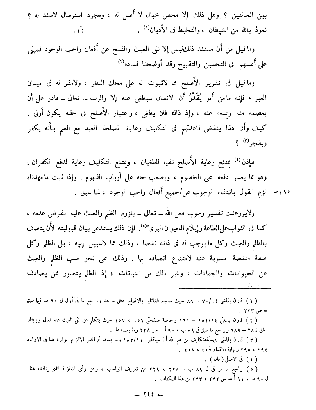وَمَا قيل فِي تَقْرِير الْأَصْلَح مِمَّا لَا ثُبُوت لَهُ على محك النّظر وَلَا مقرّ لَهُ فِي ميدان العبر فَإِنَّهُ مَا من أَمر يقدر أَن الانسان سيطغى عَنهُ إِلَّا والرب تَعَالَى قَادر على أَن يعصمه مِنْهُ ويمنعه عَنهُ وَإِذ ذَاك فَلَا يطغى وَاعْتِبَار الْأَصْلَح فِي حَقه يكون أولى كَيفَ وَأَن هَذَا ينْقض قاعدتهم فِي التَّكْلِيف رِعَايَة لمصْلحَة العَبْد مَعَ الْعلم بِأَنَّهُ يكفر وَيفجر