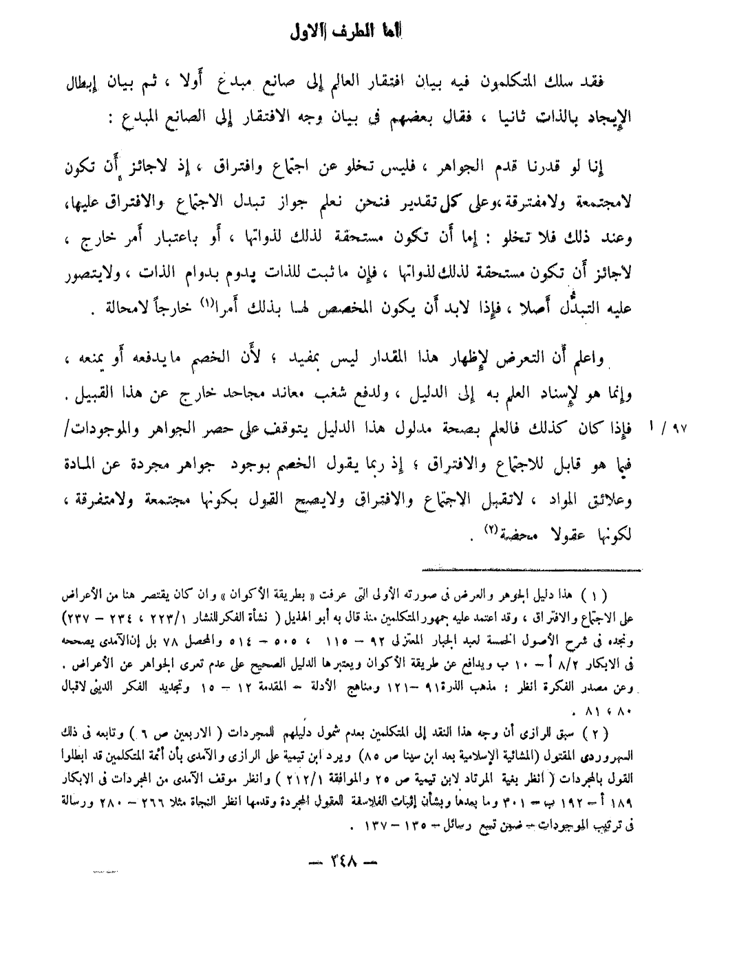 وَاعْلَم أَن التَّعَرُّض لإِظْهَار هَذَا الْمِقْدَار لَيْسَ بمفيد لِأَن الْخصم مَا يَدْفَعهُ أَو يمنعهُ وَإِنَّمَا هُوَ لإسناد الْعلم بِهِ إِلَى الدَّلِيل ولدفع شغب معاند مجاحد خَارج عَن هَذَا الْقَبِيل فَإِذا كَانَ كَذَلِك فالعلم بِصِحَّة مَدْلُول هَذَا الدَّلِيل يتَوَقَّف على حصر الْجَوَاهِر والموجودات فِيمَا هُوَ قَابل للاجتماع والافتراق إِذْ رُبمَا يَقُول الْخصم بِوُجُود جَوَاهِر مُجَرّدَة عَن الْمَادَّة وعلائق الْموَاد لَا تقبل الِاجْتِمَاع والافتراق وَلَا يَصح القَوْل بِكَوْنِهَا مجتمعة وَلَا مُتَفَرِّقَة لكَونهَا عقولا مَحْضَة