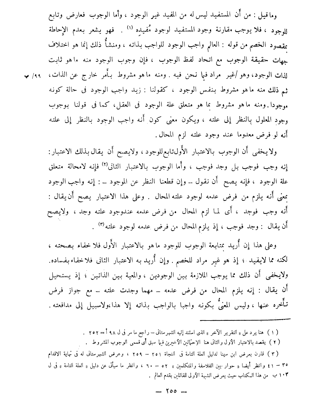وعَلى هَذَا إِن أُرِيد بمتابعة الْوُجُوب للوجود مَا هُوَ بِالِاعْتِبَارِ الأول فَلَا خَفَاء بِصِحَّتِهِ لكنه مِمَّا لَا يُفِيد إِذْ هُوَ غير مُرَاد للخصم وَإِن أُرِيد بِهِ الِاعْتِبَار الثانى فَلَا خَفَاء بفساده وَلَا يخفى أَن ذَلِك مِمَّا يُوجب الْمُلَازمَة بَين الوجودين والمعية بَين الذاتين إِذْ يَسْتَحِيل أَن يُقَال إِنَّه يلْزم الْمحَال من فرض عَدمه مهما وجدت علته مَعَ جَوَاز فرض تَأَخره عَنْهَا وَلَيْسَ الْمَعْنى بِكَوْنِهِ وَاجِبا بِالْوَاجِبِ بِذَاتِهِ إِلَّا هَذَا وَلَا سَبِيل إِلَى مدافعته