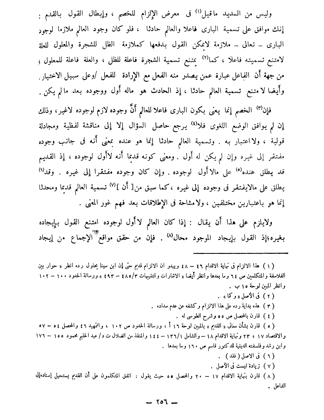 فَإِن الْخصم إِنَّمَا يعْنى بِكَوْن البارى فَاعِلا للْعَالم أَن وجوده لَازم لوُجُوده لَا غير وَذَلِكَ إِن لم يُوَافق الْوَضع اللغوى فَلَا يرجع حَاصِل السُّؤَال إِلَّا إِلَى مناقشة لفظية ومجادلة قولية وَلَا اعْتِبَار بِهِ وَتَسْمِيَة الْعَالم حَادِثا إِنَّمَا هُوَ عِنْده بِمَعْنى أَنه فِي جَانب وجوده مفتقر إِلَى غَيره وَإِن لم يكن لَهُ أول وَمعنى كَونه قَدِيما أَنه لَا أول لوُجُوده إِذْ الْقَدِيم قد يُطلق عِنْده على مَا لَا أول لوُجُوده وَإِن كَانَ وجوده مفتقرا إِلَى غَيره وَقد يُطلق على مَا لَا يفْتَقر فِي وجوده إِلَى غَيره كَمَا سبق من أَن تَسْمِيَة الْعَالم قَدِيما ومحدثا إِنَّمَا هُوَ باعتبارين مُخْتَلفين وَلَا مشاحة فِي الإطلاقات بعد فهم غور الْمَعْنى