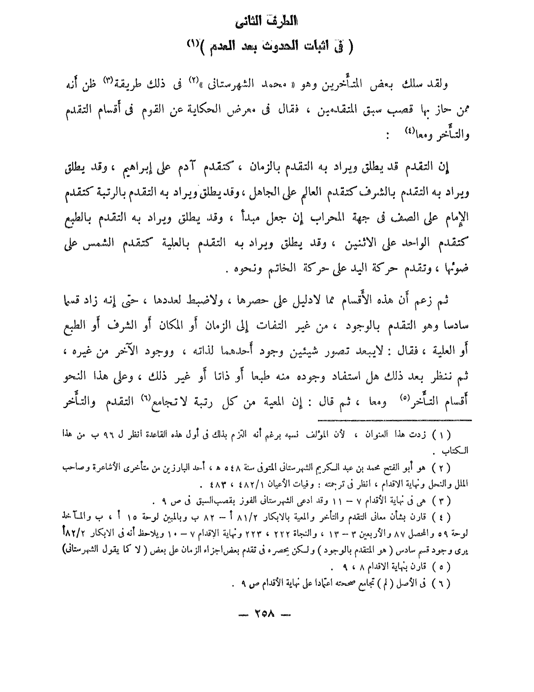 وَلَقَد سلك بعض الْمُتَأَخِّرين هُوَ مُحَمَّد الشهرستانى فِي ذَلِك طَريقَة ظن أَنه مِمَّن حَاز بهَا قصب سبق الْمُتَقَدِّمين فَقَالَ فِي معرض الْحِكَايَة عَن الْقَوْم فِي أَقسَام التَّقَدُّم والتأخر ومعا