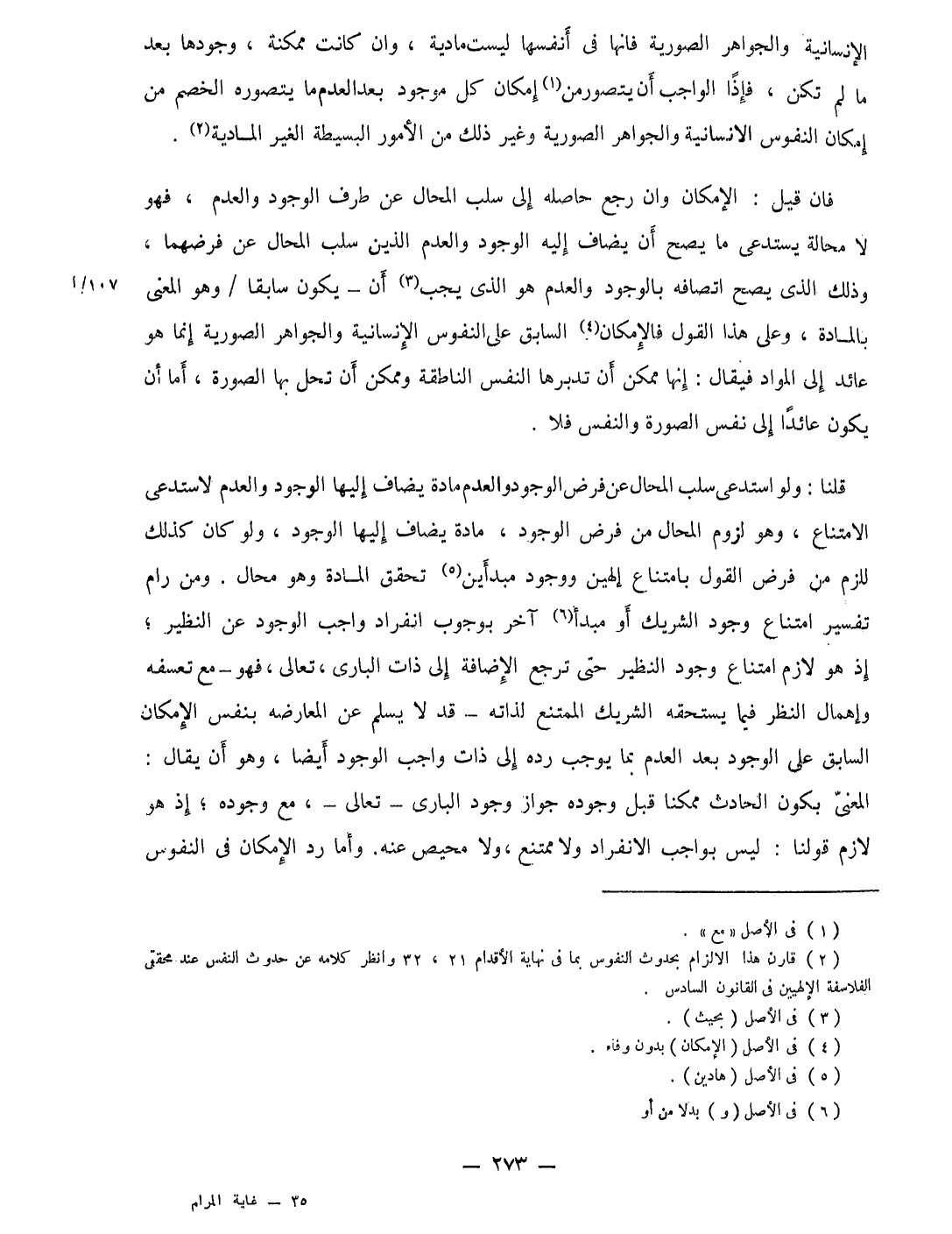 فان قيل الْإِمْكَان وان رَجَعَ حَاصله إِلَى سلب الْمحَال عَن طرف الْوُجُود والعدم فَهُوَ لَا محَالة يستدعى مَا يَصح أَن يُضَاف إِلَيْهِ الْوُجُود والعدم الَّذين سلب الْمحَال عَن فرضهما وَذَلِكَ الذى يَصح اتصافه بالوجود والعدم هُوَ الذى يجب أَن يكون سَابِقًا وَهُوَ الْمَعْنى بالمادة وعَلى هَذَا القَوْل فالإمكان السَّابِق على النُّفُوس الإنسانية والجواهر الصورية إِنَّمَا هُوَ عَائِد إِلَى الْموَاد فَيُقَال إِنَّهَا مُمكن أَن تدبرها النَّفس الناطقة وممكن أَن تحل بهَا الصُّورَة أما ان يكون عَائِدًا إِلَى نفس الصُّورَة وَالنَّفس فَلَا