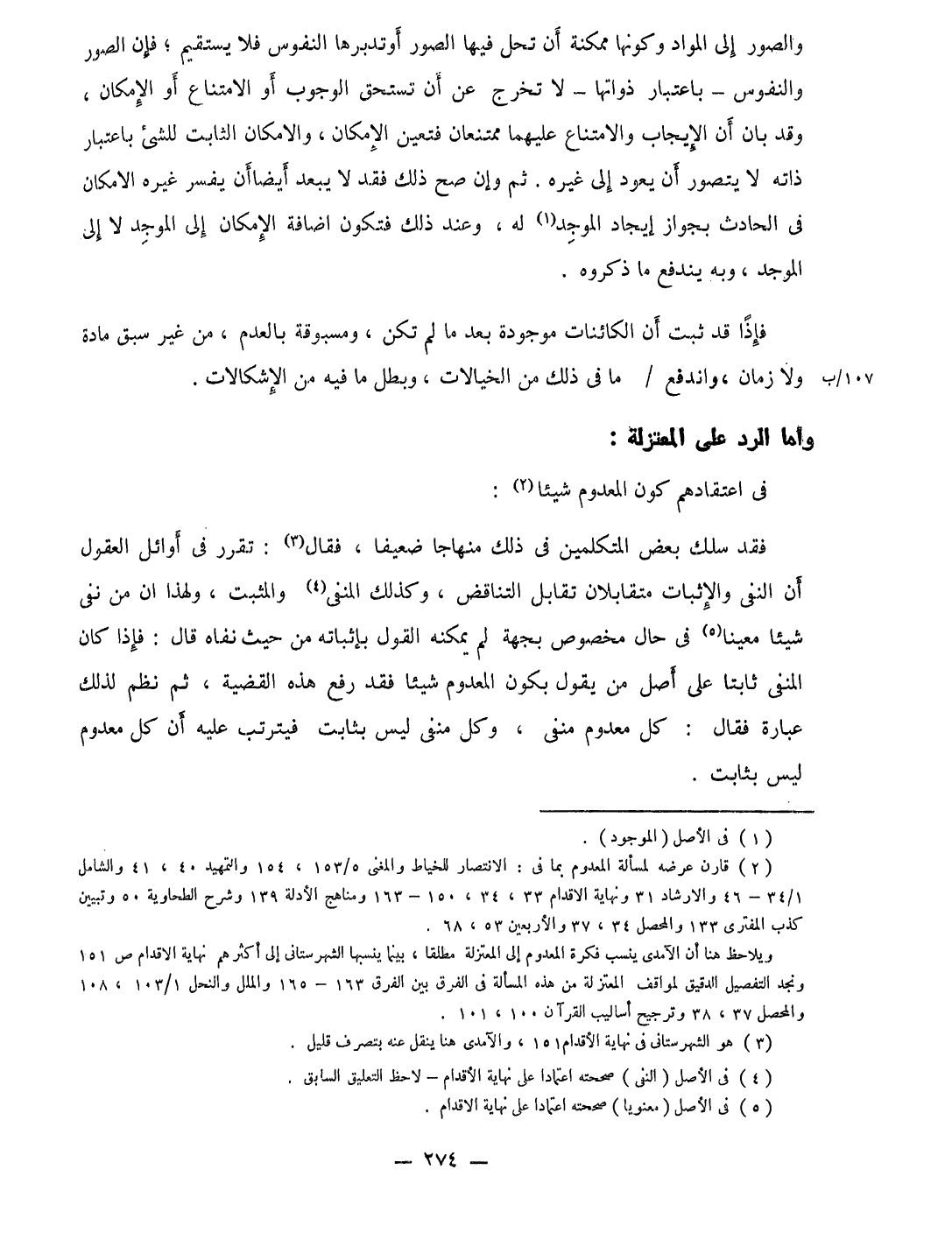 فقد سلك بعض الْمُتَكَلِّمين فِي ذَلِك منهاجا ضَعِيفا فَقَالَ تقرر فِي أَوَائِل الْعُقُول أَن النفى وَالْإِثْبَات متقابلان تقَابل التَّنَاقُض وَكَذَلِكَ المنفى والمثبت وَلِهَذَا ان من نفى شَيْئا معينا فِي حَال مَخْصُوص بِجِهَة لم يُمكنهُ القَوْل بإثباته من حَيْثُ نَفَاهُ قَالَ فَإِذا كَانَ المنفى ثَابتا على أصل من يَقُول بِكَوْن الْمَعْدُوم شَيْئا فقد رفع هَذِه الْقَضِيَّة ثمَّ نظم لذَلِك عبارَة فَقَالَ كل مَعْدُوم منفى وكل منفى لَيْسَ بِثَابِت فيترتب عَلَيْهِ أَن كل مَعْدُوم لَيْسَ بِثَابِت
