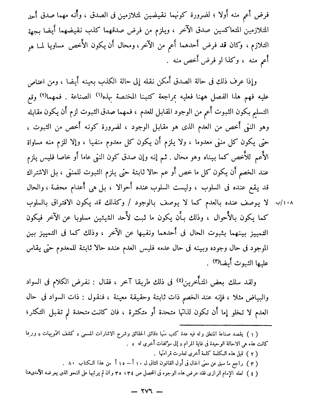 وَإِذا عرف ذَلِك فِي حَالَة الصدْق أمكن نَقله إِلَى حَالَة الْكَذِب بِعَيْنِه أَيْضا وَمن اعتاص عَلَيْهِ فهم هَذَا الْفَصْل هَهُنَا فَعَلَيهِ بمراجعة كتبنَا المختصة بِهَذِهِ الصِّنَاعَة فمهما وَقع التَّسْلِيم بِكَوْن الثُّبُوت اعم من الْوُجُود الْمُقَابل للعدم فمهما صدق الثُّبُوت لزم أَن يكون مُقَابِله وَهُوَ النفى أخص من الْعَدَم الذى هُوَ مُقَابل الْوُجُود لضَرُورَة كَونه أخص من الثُّبُوت حَتَّى يكون كل منفى مَعْدُوما وَلَا يلْزم أَن يكون كل مَعْدُوم منفيا وَإِلَّا للَزِمَ مِنْهُ مُسَاوَاة الْأَعَمّ للأخص كَمَا بَيناهُ وَهُوَ محَال ثمَّ إِنَّه وَإِن صدق كَون النفى عَاما اَوْ خَاصّا فَلَيْسَ يلْزم عِنْد الْخصم أَن يكون كل مَا خص أَو عَم حَالا ثَابِتَة حَتَّى يلْزم الثُّبُوت للمنفى بل الِاشْتِرَاك قد يَقع عِنْده فِي السلوب وَلَيْسَت السلوب عِنْده أحوالا بل هى أعدام مَحْضَة وَالْحَال لَا يُوصف عِنْده بِالْعدمِ كَمَا لَا يُوصف بالوجود وَكَذَلِكَ قد يكون الِافْتِرَاق بالسلوب كَمَا يكون بالأحوال وَذَلِكَ بِأَن يكون مَا ثَبت لأحد الشَّيْئَيْنِ مسلوبا عَن الآخر فَيكون التَّمْيِيز بَينهمَا بِثُبُوت الْحَال فِي أَحدهمَا ونفيها عَن الآخر وَذَلِكَ كَمَا فِي التَّمْيِيز بَين الْمَوْجُود فِي حَال وجوده وَبَينه فِي حَال عَدمه فَلَيْسَ الْعَدَم عِنْده حَالا ثَابِتَة للمعدوم حَتَّى يُقَاس عَلَيْهَا الثُّبُوت أَيْضا
