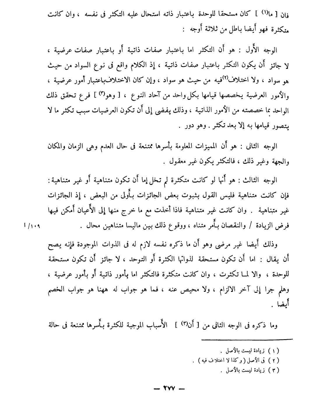 الْوَجْه الثَّالِث هُوَ أَنَّهَا لَو كَانَت متكثرة لم تخل إِمَّا أَن تكون متناهية أَو غير متناهية فَإِن كَانَت متناهية فَلَيْسَ القَوْل بِثُبُوت بعض الجائزات بِأولى من الْبَعْض إِذْ الجائزات غير متناهية وان كَانَت غير متناهية فاذا أخذت مَعَ مَا خرج مِنْهَا إِلَى الْأَعْيَان أمكن فِيهَا فرض الزِّيَادَة وَالنُّقْصَان بِأَمْر متناه وَوُقُوع ذَلِك بَين مَا ليسَا متناهين محَال