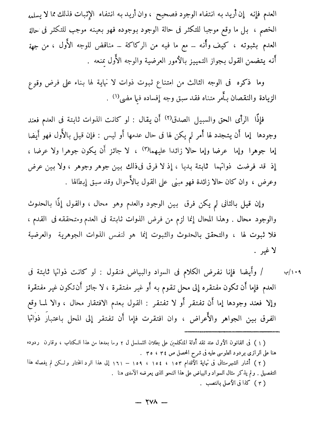 الْعَدَم فَإِنَّهُ إِن أُرِيد بِهِ انتقاء الْوُجُود فَصَحِيح وان أُرِيد بِهِ انْتِفَاء الْإِثْبَات فَذَلِك مِمَّا لَا يُسلمهُ الْخصم بل مَا وَقع مُوجبا للتكثر فِي حَالَة الْوُجُود بِوُجُودِهِ فَهُوَ بِعَيْنِه مُوجب للتكثر فِي حَالَة الْعَدَم بِثُبُوتِهِ كَيفَ وَأَنه مَعَ مَا فِيهِ من الركاكة مُنَاقض للْوَجْه الأول من جِهَة أَنه يتَضَمَّن القَوْل بِجَوَاز التَّمْيِيز بالأمور العرضية وَالْوَجْه الأول يمنعهُ