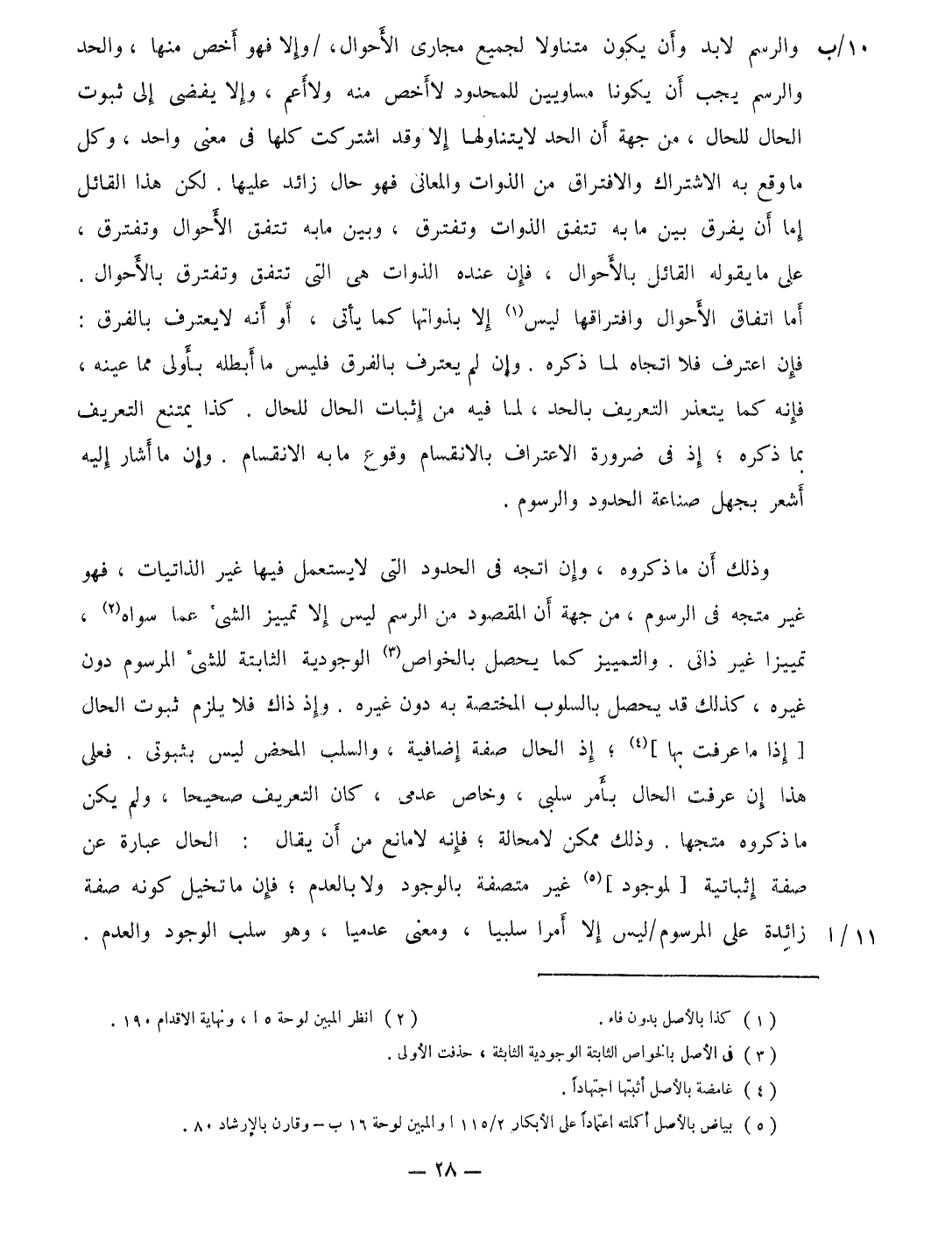 وَذَلِكَ أَن مَا ذَكرُوهُ وَإِن اتجه فِي الْحُدُود الَّتِي لَا يسْتَعْمل فِيهَا غير الذاتيات فَهُوَ غير مُتَّجه فِي الرسوم من جِهَة ان الْمَقْصُود من الرَّسْم لَيْسَ إِلَّا تَمْيِيز الشئ عَمَّا سواهُ تمييزا غير ذاتي والتمييز كَمَا يحصل بالخواص والوجودية الثَّابِتَة للشئ المرسوم دون غَيره كَذَلِك قد يحصل بالسلوب المختصة بِهِ دون غَيره وَإِذ ذَاك فَلَا يلْزم ثُبُوت الْحَال إِذا مَا عرفت بهَا إِذْ الْحَال صفة إضافية وَالسَّلب الْمَحْض لَيْسَ بثبوتي فعلى هَذَا إِن عرفت الْحَال بِأَمْر سلبى وخاص عدمى كَانَ التَّعْرِيف صَحِيحا وَلم يكن مَا ذَكرُوهُ متجها وَذَلِكَ مُمكن لَا محَالة فَإِنَّهُ لَا مَانع من أَن يُقَال الْحَال عبارَة عَن صفة إثباتية لموجود غير متصفة بالوجود وَلَا بِالْعدمِ فَإِن مَا تخيل كَونه صفة زَائِدَة على المرسوم لَيْسَ إِلَّا أمرا سلبيا وَمعنى عدميا وَهُوَ سلب الْوُجُود والعدم