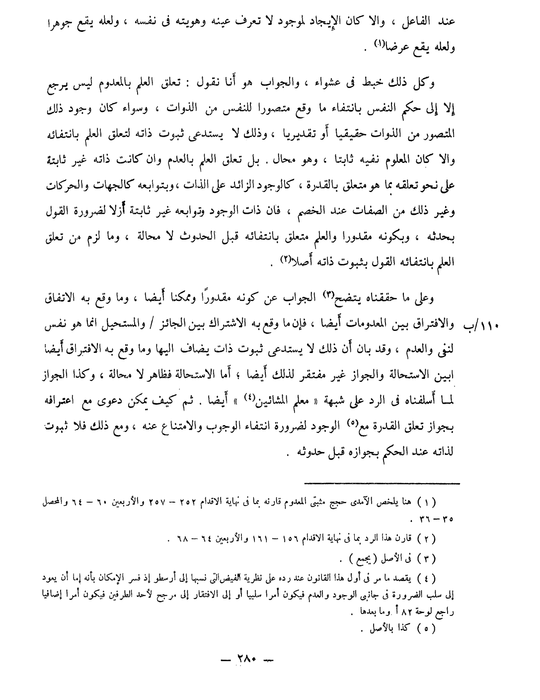وعَلى مَا حققناه يَتَّضِح الْجَواب عَن كَونه مَقْدُورًا وممكنا أَيْضا وَمَا وَقع بِهِ الِاتِّفَاق والافتراق بَين المعدومات أَيْضا فَإِن مَا وَقع بِهِ الِاشْتِرَاك بَين الْجَائِز والمستحيل انما هُوَ نفس لنفى والعدم وَقد بَان أَن ذَلِك لَا يستدعى ثُبُوت ذَات يُضَاف اليها وَمَا وَقع بِهِ الِافْتِرَاق أَيْضا ابين الاستحالة وَالْجَوَاز غير مفتقر لذَلِك أَيْضا أما الاستحالة فَظَاهر لَا محَالة وَكَذَا الْجَوَاز لما أسلفناه فِي الرَّد على شُبْهَة معلم الْمَشَّائِينَ أَيْضا ثمَّ كَيفَ يُمكن دَعْوَى مَعَ اعترافه بِجَوَاز تعلق الْقُدْرَة مَعَ الْوُجُود لضَرُورَة انْتِفَاء الْوُجُوب والامتناع عَنهُ وَمَعَ ذَلِك فَلَا ثُبُوت لذاته عِنْد الحكم بِجَوَازِهِ قبل حُدُوثه