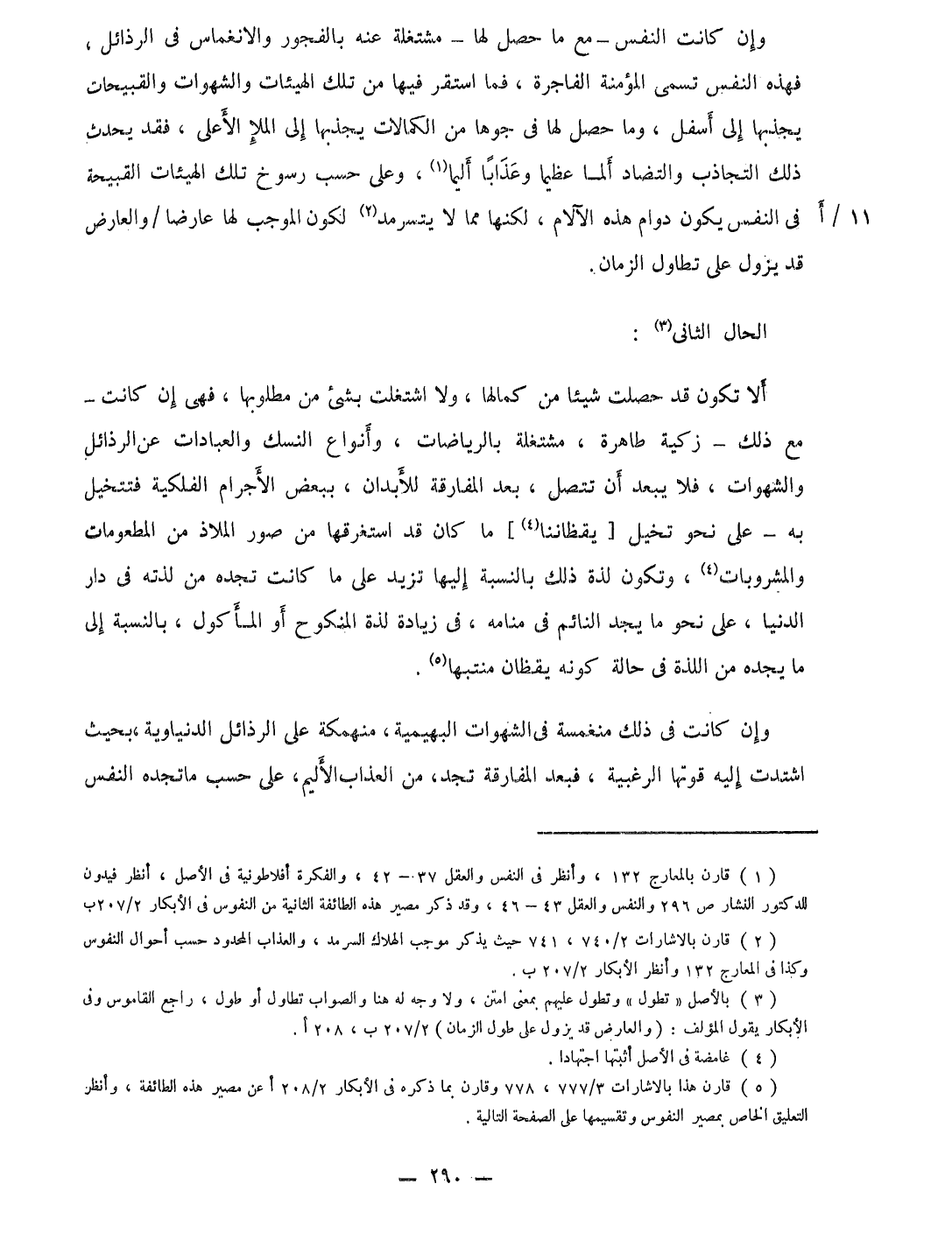 وَإِن كَانَت النَّفس مَعَ مَا حصل لَهَا مشتغلة عَنهُ بِالْفُجُورِ والانغماس فِي الرذائل فَهَذِهِ النَّفس تسمى المؤمنة الْفَاجِرَة فَمَا اسْتَقر فِيهَا من تِلْكَ الهيئات والشهوات والقبيحات يجذبها إِلَى أَسْفَل وَمَا حصل لَهَا فِي جوها من الكمالات يجذبها إِلَى الملإ الْأَعْلَى فقد يحدث ذَلِك التجاذب والتضاد ألما عَظِيما وَعَذَابًا أَلِيمًا وعَلى حسب رسوخ تِلْكَ الهيئات القبيحة فِي النَّفس يكون دوَام هَذِه الآلام لَكِنَّهَا مِمَّا لَا يتسرمد لكَون الْمُوجب لَهَا عارضا والعارض قد يَزُول على تطاول الزَّمَان
