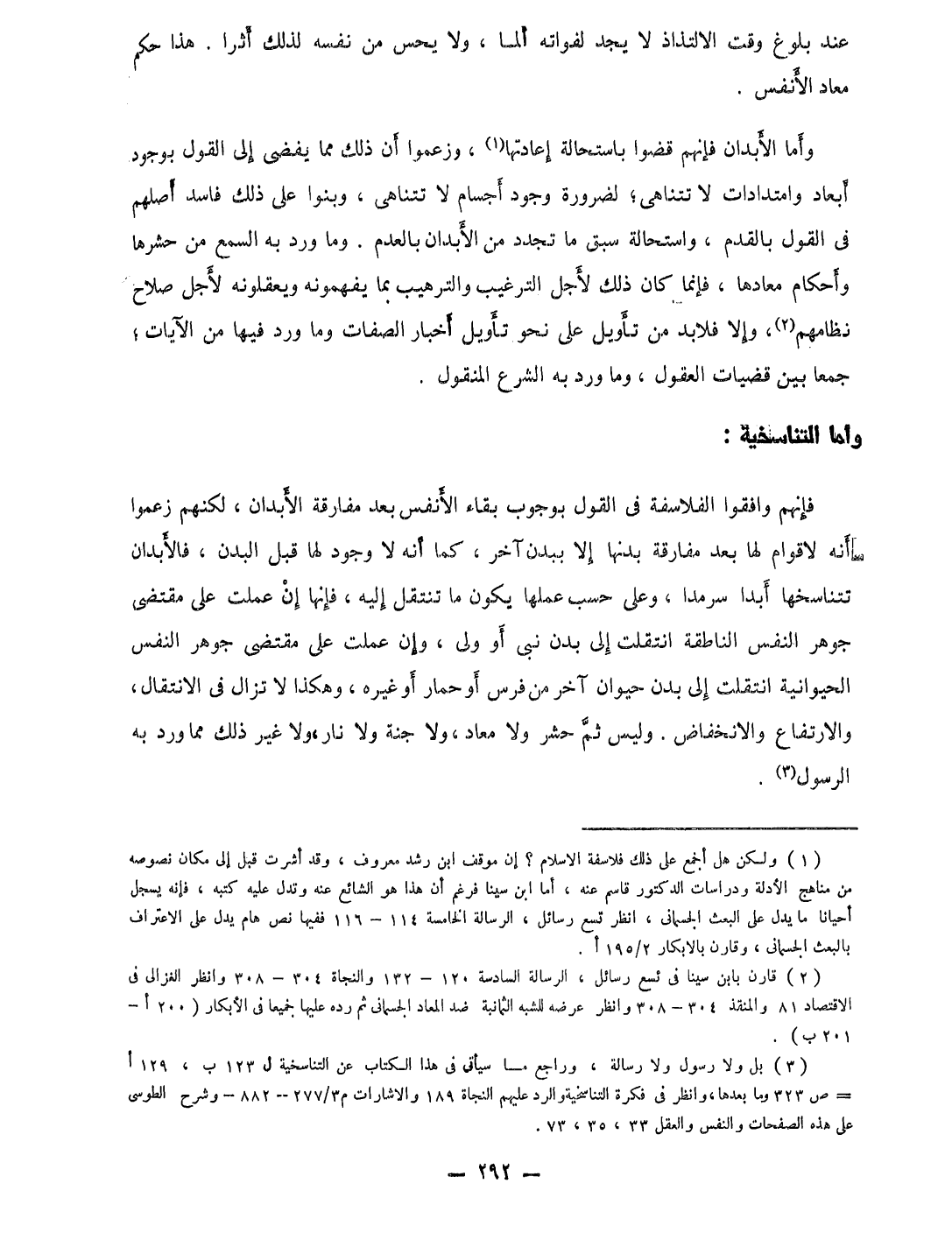 فَإِنَّهُم وافقوا الفلاسفة فِي القَوْل بِوُجُوب بَقَاء الْأَنْفس بعد مُفَارقَة الْأَبدَان لكِنهمْ زَعَمُوا أَنه لَا قوام لَهَا بعد مُفَارقَة بدنهَا إِلَّا ببدن آخر كَمَا أَنه لَا وجود لَهَا قبل الْبدن فالأبدان تتناسخها أبدا سرمدا وعَلى حسب عَملهَا يكون مَا تنْتَقل إِلَيْهِ فَإِنَّهَا إِن عملت على مُقْتَضى جَوْهَر النَّفس الناطقة انْتَقَلت إِلَى بدن نبى أَو ولى وَإِن عملت على مُقْتَضى جَوْهَر النَّفس الحيوانية انْتَقَلت إِلَى بدن حَيَوَان آخر من فرس أَو حمَار أَو غَيره وَهَكَذَا لَا تزَال فِي الِانْتِقَال والارتفاع والانخفاض وَلَيْسَ ثمَّ حشر وَلَا معاد وَلَا جنَّة وَلَا نَار وَلَا غير ذَلِك مِمَّا ورد بِهِ الرَّسُول