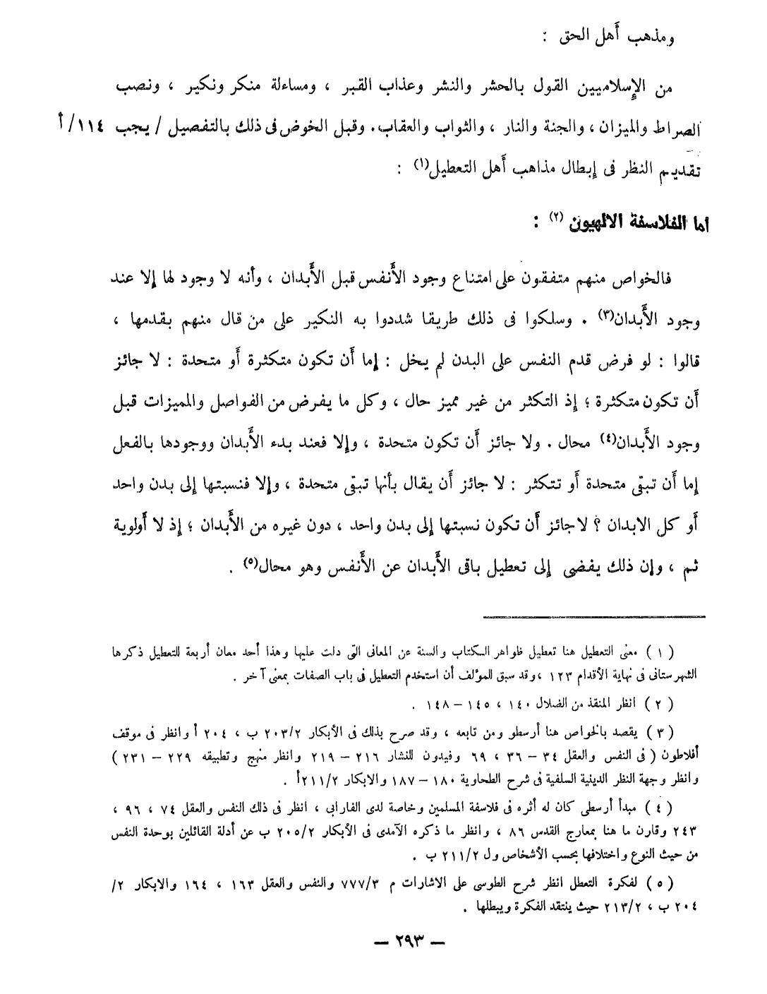 وَمذهب أهل الْحق من الإسلاميين القَوْل بالحشر والنشر وَعَذَاب الْقَبْر ومساءلة مكنر وَنَكِير وَنصب الصِّرَاط وَالْمِيزَان وَالْجنَّة وَالنَّار وَالثَّوَاب وَالْعِقَاب وَقبل الْخَوْض فِي ذَلِك بالتفصيل يجب تَقْدِيم النّظر فِي إبِْطَال مَذَاهِب أهل التعطيل