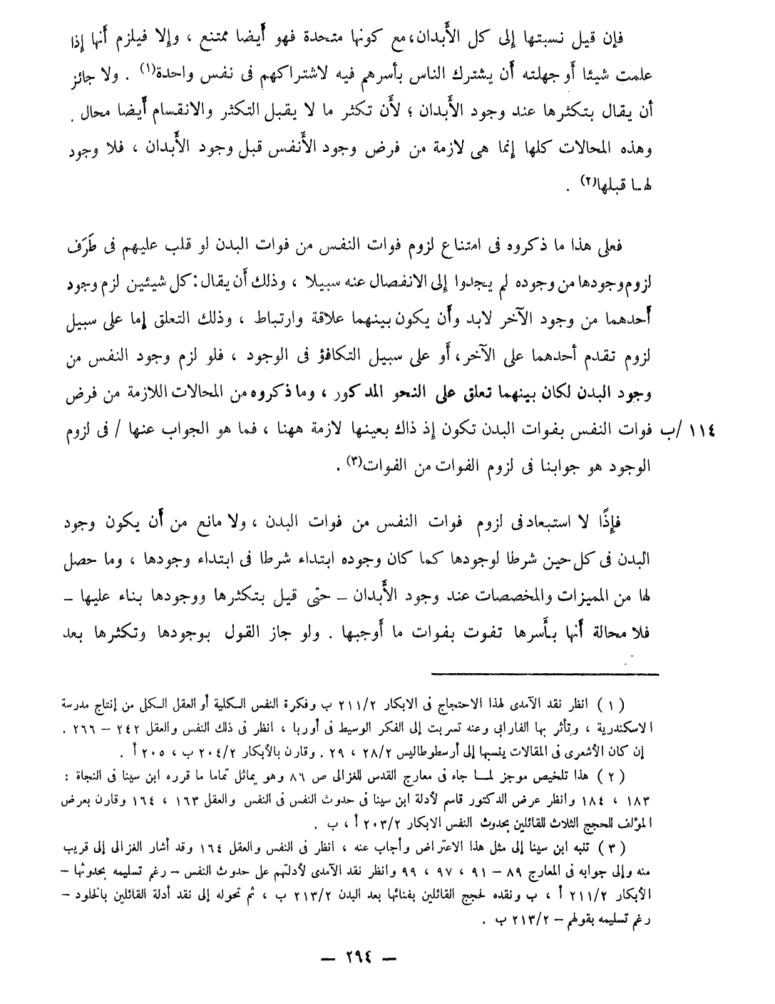 فَإِن قيل نسبتها إِلَى كل الْأَبدَان مَعَ كَونهَا متحدة فَهُوَ أَيْضا مُمْتَنع وَإِلَّا فَيلْزم أَنَّهَا إِذا علمت شَيْئا أَو جهلته أَن يشْتَرك النَّاس بأسرهم فِيهِ لاشتراكهم فِي نفس وَاحِدَة وَلَا جَائِز أَن يُقَال بتكثرها عِنْد وجود الْأَبدَان لِأَن تكْثر مَا لَا يقبل التكثر والانقسام أَيْضا محَال وَهَذِه المحالات كلهَا إِنَّمَا هى لَازِمَة من فرض وجود الْأَنْفس قبل وجود الْأَبدَان فَلَا وجود لَهَا قبلهَا
