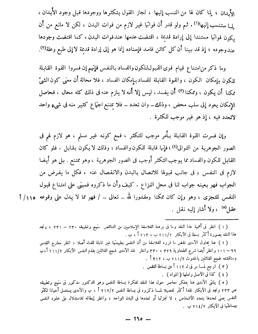 الْأَبدَان لما كَانَ لَهَا من النّسَب إِلَيْهَا لجَاز القَوْل بتكثرها ووجودها قبل وجود الْأَبدَان لما ستنسب إِلَيْهَا ثمَّ وَلَو قدر أَن فَوَاتهَا غير لَازم من فَوَات الْبدن لَكِن لَا مَانع من أَن يكون فَوَاتهَا مُسْتَندا إِلَى إِرَادَة قديمَة اقْتَضَت عدمهَا عِنْد فَوَات الْبدن كَمَا اقْتَضَت وجودهَا عِنْد وجوده إِذْ قد بَينا أَن كل كَائِن فَاسد فإسناده إِنَّمَا هُوَ إِلَى إِرَادَة قديمَة لَا إِلَى طبع وعله