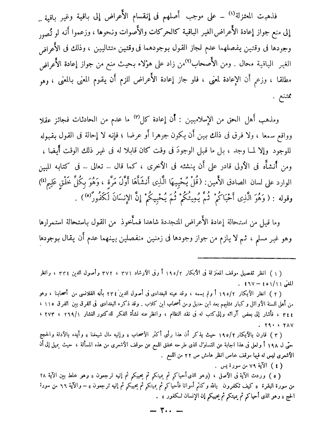 فَذَهَبت الْمُعْتَزلَة على مُوجب أصلهم فِي إنقسام الْأَعْرَاض إِلَى بَاقِيَة وَغير بَاقِيَة إِلَى منع جَوَاز إِعَادَة الْأَعْرَاض الْغَيْر الْبَاقِيَة كالحركات والأصوات وَنَحْوهَا وَزَعَمُوا أَنه لَو تصور وجودهَا فِي وَقْتَيْنِ يفصلهما عدم لجَاز القَوْل بوجودهما فِي وَقْتَيْنِ متتاليين وَذَلِكَ فِي الْأَعْرَاض الْغَيْر الْبَاقِيَة محَال وَمن الْأَصْحَاب من زَاد على هَؤُلَاءِ لحيث منع من جَوَاز إِعَادَة الْأَعْرَاض مُطلقًا وَزعم أَن الْإِعَادَة لِمَعْنى فَلَو جَازَ إِعَادَة الْأَعْرَاض للَزِمَ أَن يقوم الْمَعْنى بِالْمَعْنَى وَهُوَ مُمْتَنع