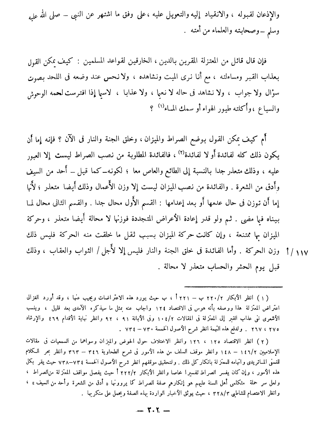 أم كَيفَ يُمكن القَوْل بِوَضْع الصِّرَاط وَالْمِيزَان وَخلق الْجنَّة وَالنَّار فِي الْآن فَإِنَّهُ إِمَّا أَن يكون ذَلِك كُله لفائدة أَو لَا لفائدة فالفائدة الْمَطْلُوبَة من نصب الصِّرَاط لَيست إِلَّا العبور عَلَيْهِ وَذَلِكَ مُتَعَذر جدا بِالنِّسْبَةِ إِلَى الطائع وَالْعَاص مَعًا لكَونه كَمَا قيل أحد من السَّيْف وأدق من الشعرة والفائدة من نصب الْمِيزَان لَيست إِلَّا وزن الْأَعْمَال وَذَلِكَ أَيْضا مُتَعَذر لِأَنَّهَا إِمَّا أَن توزن فى حَال عدمهَا أَو بعد إعدامها الْقسم الأول محَال جدا وَالْقسم الثانى محَال لما بَيناهُ فِيمَا مضى ثمَّ وَلَو قدر إِعَادَة الْأَعْرَاض المتجددة فوزنها لَا محَالة أَيْضا مُتَعَذر وحركة الْمِيزَان بهَا ممتنعة وَإِن كَانَت حَرَكَة الْمِيزَان بِسَبَب ثقل مَا خلقت مِنْهُ الْحَرَكَة فَلَيْسَ ذَلِك وزن الْحَرَكَة وَأما الْفَائِدَة فِي خلق الْجنَّة وَالنَّار فَلَيْسَ إِلَّا لأجل الثَّوَاب وَالْعِقَاب وَذَلِكَ قبل يَوْم الْحَشْر والحساب مُتَعَذر لَا محَالة