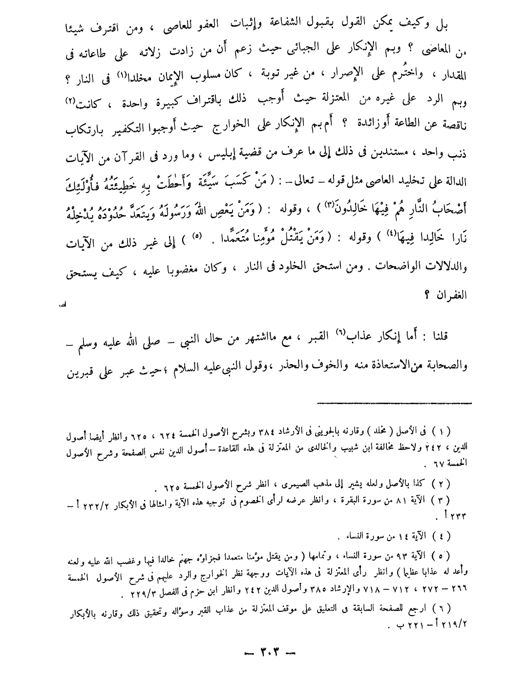 بل وَكَيف يُمكن القَوْل بِقبُول الشَّفَاعَة وَإِثْبَات الْعَفو للعاصى وَمن اقْتَرَف شَيْئا من المعاصى وَبِمَ الْإِنْكَار على الجبائى حَيْثُ زعم أَن من زَادَت زلاته على طاعاته فِي الْمِقْدَار واخترم على الْإِصْرَار من غير تَوْبَة كَانَ مسلوب الْإِيمَان مخلدا فِي النَّار وَبِمَ الرَّد على غَيره من الْمُعْتَزلَة حَيْثُ أوجب ذَلِك باقتراف كَبِيرَة وَاحِدَة كَانَت نَاقِصَة عَن الطَّاعَة أَو زَائِدَة أم بِمَ الْإِنْكَار على الْخَوَارِج حَيْثُ أوجبوا التَّكْفِير بإرتكاب ذَنْب وَاحِد مستندين فِي ذَلِك إِلَى مَا عرف من قَضِيَّة إِبْلِيس وَمَا ورد فِي الْقُرْآن من الْآيَات الدَّالَّة على تخليد العاصى مثل قَوْله تَعَالَى {من كسب سَيِّئَة وأحاطت بِهِ خطيئته فَأُولَئِك أَصْحَاب النَّار هم فِيهَا خَالدُونَ} وَقَوله {وَمن يعْص الله وَرَسُوله ويتعد حُدُوده يدْخلهُ نَارا خَالِدا فِيهَا} وَقَوله {وَمن يقتل مُؤمنا مُتَعَمدا} إِلَى غير ذَلِك من الْآيَات والدلالات الواضحات وَمن اسْتحق الخلود فِي النَّار وَكَانَ مغضوبا عَلَيْهِ كَيفَ يسْتَحق الغفران