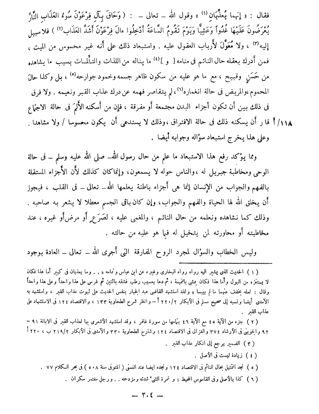 فَقَالَ إنَّهُمَا يعذبان وَقَول الله تَعَالَى {وحاق بآل فِرْعَوْن سوء الْعَذَاب النَّار يعرضون عَلَيْهَا غدوا وعشيا وَيَوْم تقوم السَّاعَة أدخلُوا آل فِرْعَوْن أَشد الْعَذَاب} فَلَا سَبِيل إِلَيْهِ وَلَا معول لأرباب الْعُقُول عَلَيْهِ واستبعاد ذَلِك على أَنه غير محسوس من الْمَيِّت فَمن أدْرك بعقله حَال النَّائِم فِي مَنَامه وَمَا يَنَالهُ من اللَّذَّات والتألمات بِسَبَب مَا يُشَاهِدهُ من حسن وقبيح مَعَ مَا هُوَ عَلَيْهِ من سُكُون ظَاهر جِسْمه وخمود جوارحه بل وَكَذَا حَال المحموم وَالْمَرِيض فِي حَالَة انغماره لم يتقاصر فهمه عَن دَرك عَذَاب الْقَبْر ونعيمه وَلَا فرق فِي ذَلِك بَين أَن تكون أَجزَاء الْبدن مجتمعة أَو مفرقة فَإِن من أسْكنهُ الْأَلَم فِي حَالَة الِاجْتِمَاع قَادر أَن يسكنهُ ذَلِك فِي حَالَة الِافْتِرَاق وَذَلِكَ لَا يستدعى أَن يكون محسوسا وَلَا مشاهدا