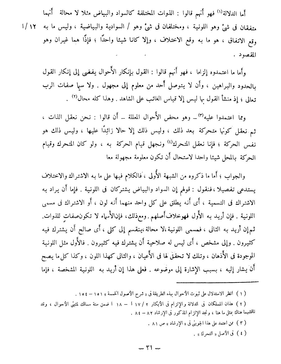 وَأما مَا اعتمدوه إلزاما فَهُوَ أَنهم قَالُوا القَوْل بإنكار الْأَحْوَال يفضى إِلَى إِنْكَار القَوْل بالحدود والبراهين وَأَن لَا يتَوَصَّل أحد من مَعْلُوم إِلَى مَجْهُول وَلَا سِيمَا صِفَات الرب تَعَالَى إِذْ منشأ القَوْل بهَا لَيْسَ إِلَّا قِيَاس الْغَائِب على الشَّاهِد وَهَذَا كُله محَال