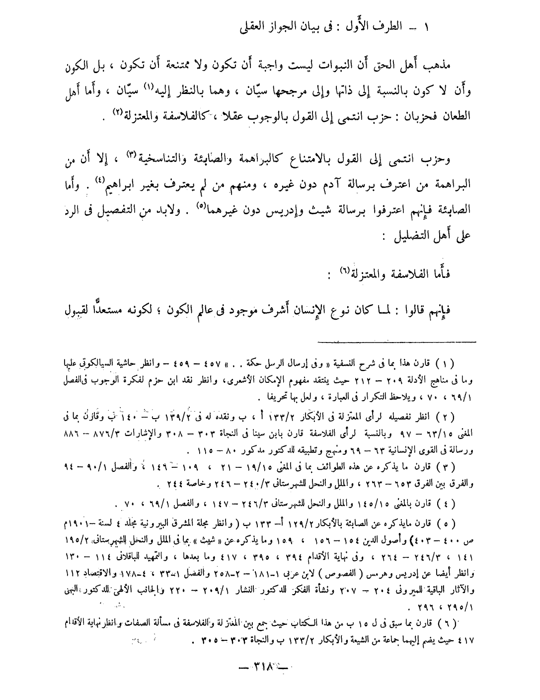 وحزب انْتَمَى إِلَى القَوْل بالأمتناع كالبراهمة والصابئة والتناسخية إِلَّا أَن من البراهمة من اعْترف برسالة آدم دون غَيره وَمِنْهُم من لم يعْتَرف بِغَيْر ابراهيم وَأما الصابئة فَإِنَّهُم اعْتَرَفُوا برسالة شِيث وَإِدْرِيس دون غَيرهمَا وَلَا بُد من التَّفْصِيل فِي الرَّد على أهل التضليل