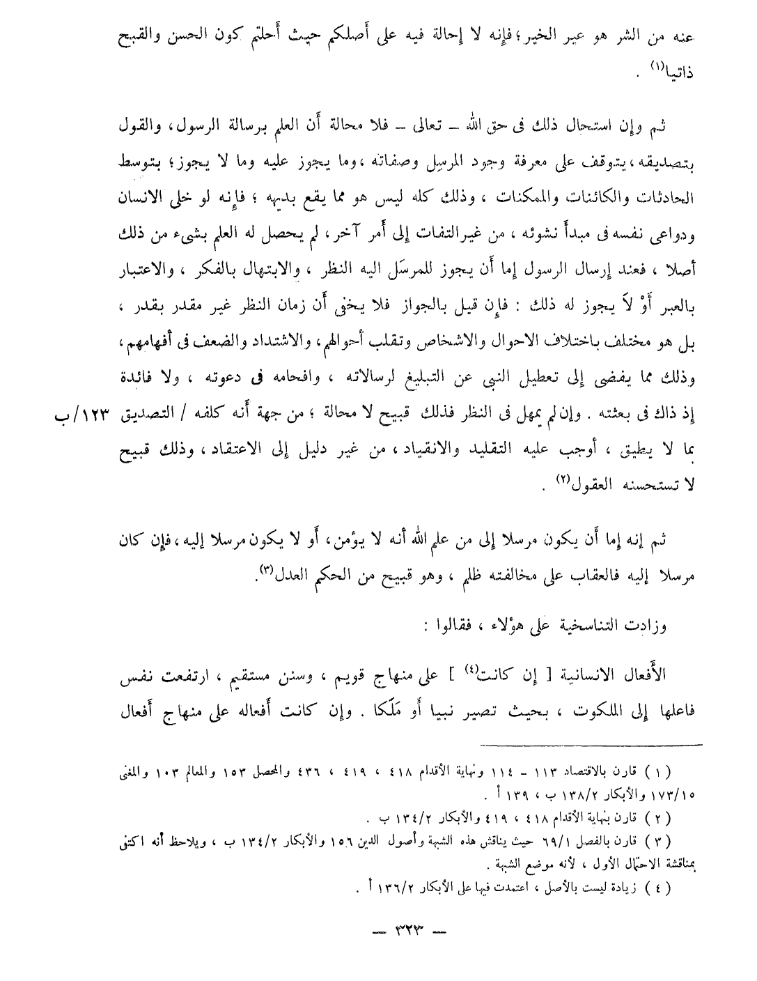 ثمَّ وَإِن اسْتَحَالَ ذَلِك فى حق الله تَعَالَى فَلَا محَالة أَن الْعلم برسالة الرَّسُول وَالْقَوْل بتصديقه يتَوَقَّف على معرفَة وجود الْمُرْسل وَصِفَاته وَمَا يجوز عَلَيْهِ وَمَا لَا يجوز بتوسط الحادثات والكائنات والممكنات وَذَلِكَ كُله لَيْسَ هُوَ مِمَّا يَقع بديهة فَإِنَّهُ لَو خلى الانسان ودواعى نَفسه فِي مبدأ نشوئه من غير الْتِفَات إِلَى أَمر آخر لم يحصل لَهُ الْعلم بشئ من ذَلِك أصلا فَعِنْدَ إرْسَال الرَّسُول إِمَّا أَن يجوز للمرسل اليه النّظر والابتهال بالفكر وَالِاعْتِبَار بالعبر أَو لَا يجوز لَهُ ذَلِك فَإِن قيل بِالْجَوَازِ فَلَا يخفى أَن زمَان النّظر غير مُقَدّر بِقدر بل هُوَ مُخْتَلف باخْتلَاف الاحوال والاشخاص وتقلب أَحْوَالهم والاشتداد والضعف فِي أفهامهم وَذَلِكَ مِمَّا يفضى إِلَى تَعْطِيل النبى عَن التَّبْلِيغ لرسالاته وافحامه فِي دَعوته وَلَا فَائِدَة إِذْ ذَاك فى بعثته وَإِن لم يُمْهل فى النّظر فَذَلِك قَبِيح لَا محَالة من جِهَة أَنه كلفه التَّصْدِيق بِمَا لَا يُطيق أوجب عَلَيْهِ التَّقْلِيد والانقياد من غير دَلِيل إِلَى الِاعْتِقَاد وَذَلِكَ قَبِيح لَا تستحسنه الْعُقُول