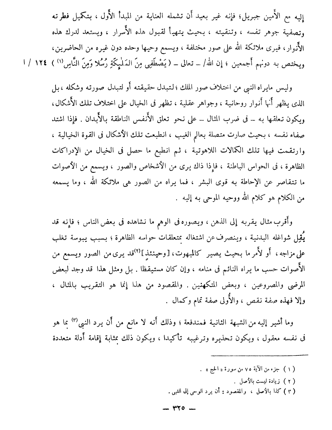 وَلَيْسَ مَا يرَاهُ النبى من اخْتِلَاف صور الْملك لتبدل حَقِيقَته أَو لتبدل صورته وشكله بل الذى يظْهر أَنَّهَا أنوار روحانية وجواهر عقلية تظهر فى الخيال على اخْتِلَاف تِلْكَ الأشكال وَيكون تعلقهَا بِهِ فى ضرب الْمِثَال على نَحْو تعلق الْأَنْفس الناطقة بالأبدان فَإِذا اشْتَدَّ صفاء نَفسه بِحَيْثُ صَارَت مُتَّصِلَة بعالم الْغَيْب انطبعت تِلْكَ الأشكال فِي الْقُوَّة الخيالية وارتقمت فِيهَا تِلْكَ الكمالات اللاهوتية ثمَّ انطبع مَا حصل فى الخيال من الإدراكات الظَّاهِرَة فِي الْحَواس الْبَاطِنَة فَإِذا ذَاك يرى من الْأَشْخَاص والصور وَيسمع من الْأَصْوَات مَا تتقاصر عَن الْإِحَاطَة بِهِ قوى الْبشر فَمَا يرَاهُ من الصُّور هى مَلَائِكَة الله وَمَا يسمعهُ من الْكَلَام هُوَ كَلَام الله ووحيه الموحى بِهِ إِلَيْهِ