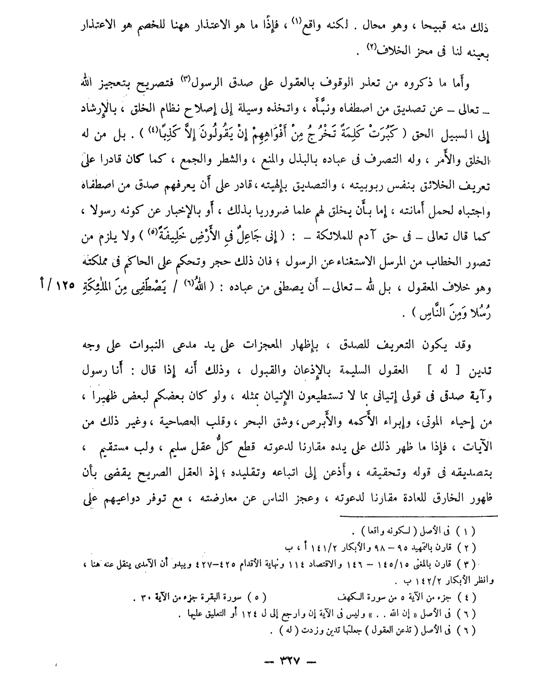 وَأما مَا ذَكرُوهُ من تعذر الْوُقُوف بالعقول على صدق الرَّسُول فتصريح بتعجيز الله تَعَالَى عَن تَصْدِيق من اصطفاه ونبأه واتخذه وَسِيلَة إِلَى إصْلَاح نظام الْخلق بالإرشاد إِلَى السَّبِيل الْحق {كَبرت كلمة تخرج من أَفْوَاههم إِن يَقُولُونَ إِلَّا كذبا} بل من لَهُ الْخلق وَالْأَمر وَله التَّصَرُّف فى عباده بالبذل وَالْمَنْع والشطر وَالْجمع كَمَا كَانَ قَادِرًا على تَعْرِيف الْخَلَائق بِنَفس ربوبيته والتصديق بإلهيته قَادر على أَن يعرفهُمْ صدق من اصطفاه واجتباه لحمل أَمَانَته إِمَّا بِأَن يخلق لَهُم علما ضَرُورِيًّا بذلك أَو بالإخبار عَن كَونه رَسُولا كَمَا قَالَ تَعَالَى فى حق آدم للْمَلَائكَة {إِنِّي جَاعل فِي الأَرْض خَليفَة} وَلَا يلْزم من تصور الْخطاب من الْمُرْسل الِاسْتِغْنَاء عَن الرَّسُول فَإِن ذَلِك حجر وتحكم على الْحَاكِم فى مَمْلَكَته وَهُوَ خلاف الْمَعْقُول بل لله تَعَالَى أَن يصطفى من عباده {الله يصطفي من الْمَلَائِكَة رسلًا وَمن النَّاس}