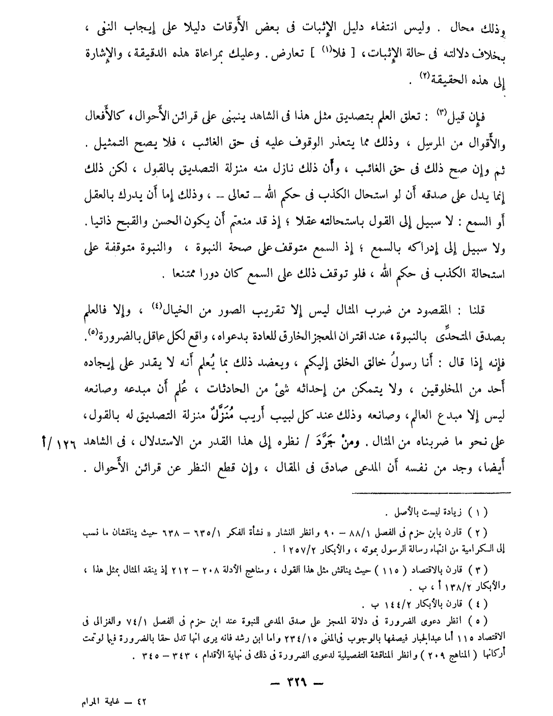 فَإِن قيل تعلق الْعلم بِتَصْدِيق مثل هَذَا فِي الشَّاهِد ينبنى على قَرَائِن الْأَحْوَال كالأفعال والأقوال من الْمُرْسل وَذَلِكَ مِمَّا يتَعَذَّر الْوُقُوف عَلَيْهِ فِي حق الْغَائِب فَلَا يَصح التَّمْثِيل ثمَّ وَإِن صَحَّ ذَلِك فى حق الْغَائِب وَأَن ذَلِك نَازل مِنْهُ منزلَة التَّصْدِيق بالْقَوْل لَكِن ذَلِك إِنَّمَا يدل على صدقه أَن لَو اسْتَحَالَ الْكَذِب فى حكم الله تَعَالَى وَذَلِكَ إِمَّا أَن يدْرك بِالْعقلِ أَو السّمع لَا سَبِيل إِلَى القَوْل باستحالته عقلا إِذْ قد منعتم أَن يكون الْحسن والقبح ذاتيا وَلَا سَبِيل إِلَى إِدْرَاكه بِالسَّمْعِ إِذْ السّمع مُتَوَقف على صِحَة النُّبُوَّة متوقفة على اسْتِحَالَة الْكَذِب فى حكم الله فَلَو توقف ذَلِك على السّمع كَانَ دورا مُمْتَنعا