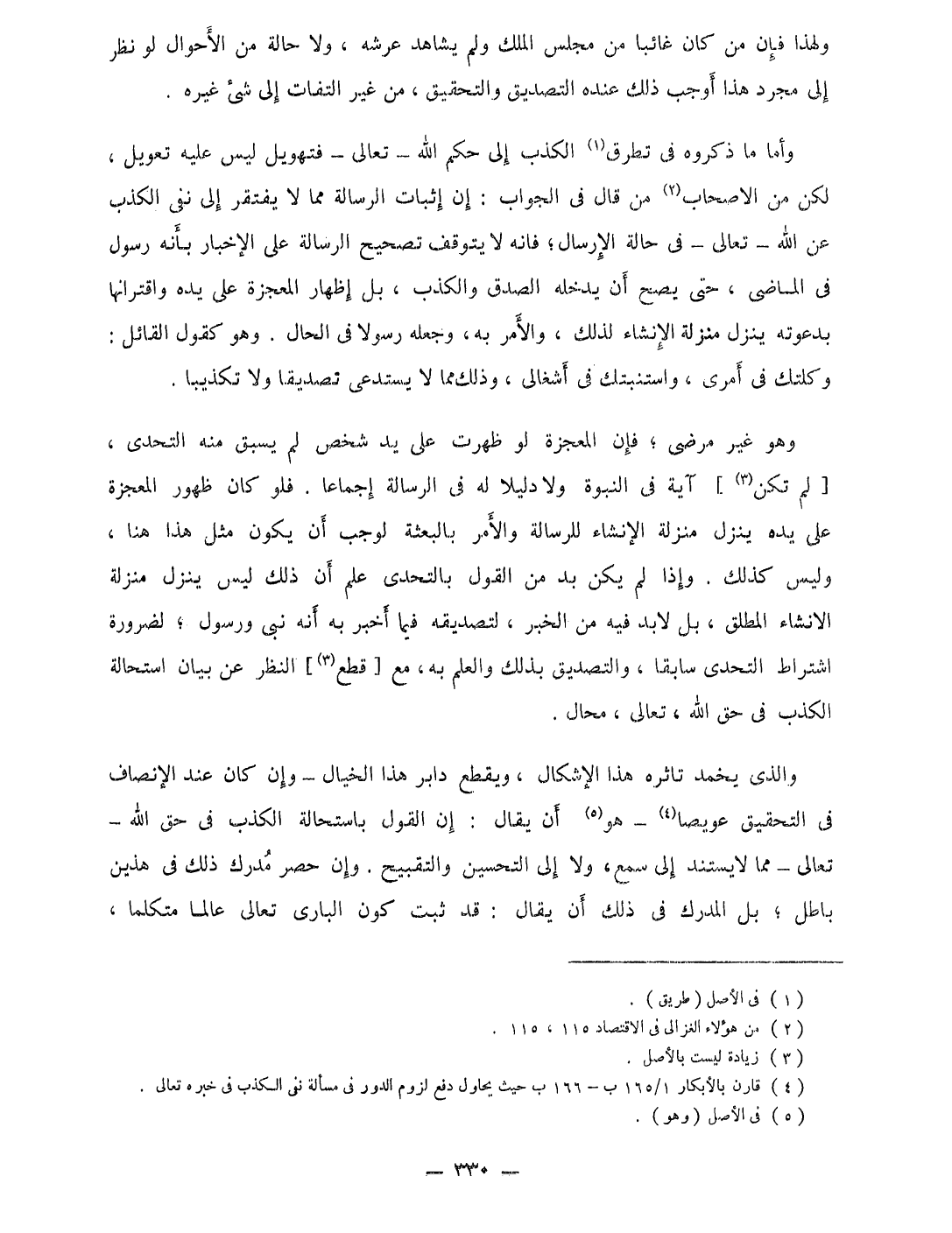 وَأما مَا ذَكرُوهُ فى تطرق الْكَذِب إِلَى حكم الله تَعَالَى فتهويل لَيْسَ عَلَيْهِ تعويل لَكِن من الاصحاب من قَالَ فى الْجَواب إِن إِثْبَات الرسَالَة مِمَّا لَا يفْتَقر إِلَى نفى الْكَذِب عَن الله تَعَالَى فى حَالَة الْإِرْسَال فَإِنَّهُ لَا يتَوَقَّف تَصْحِيح الرسَالَة على الْإِخْبَار بِأَنَّهُ رَسُول فى الماضى حَتَّى يَصح أَن يدْخلهُ الصدْق وَالْكذب بل إظهارالمعجزة على يَده واقترانها بدعوته ينزل منزلَة الْإِنْشَاء لذَلِك وَالْأَمر بِهِ وَجعله رَسُولا فى الْحَال وَهُوَ كَقَوْل الْقَائِل وَكلتك فى أمرى واستنبتك فى أشغالى وَذَلِكَ مِمَّا لَا يستدعى تَصْدِيقًا وَلَا تَكْذِيبًا