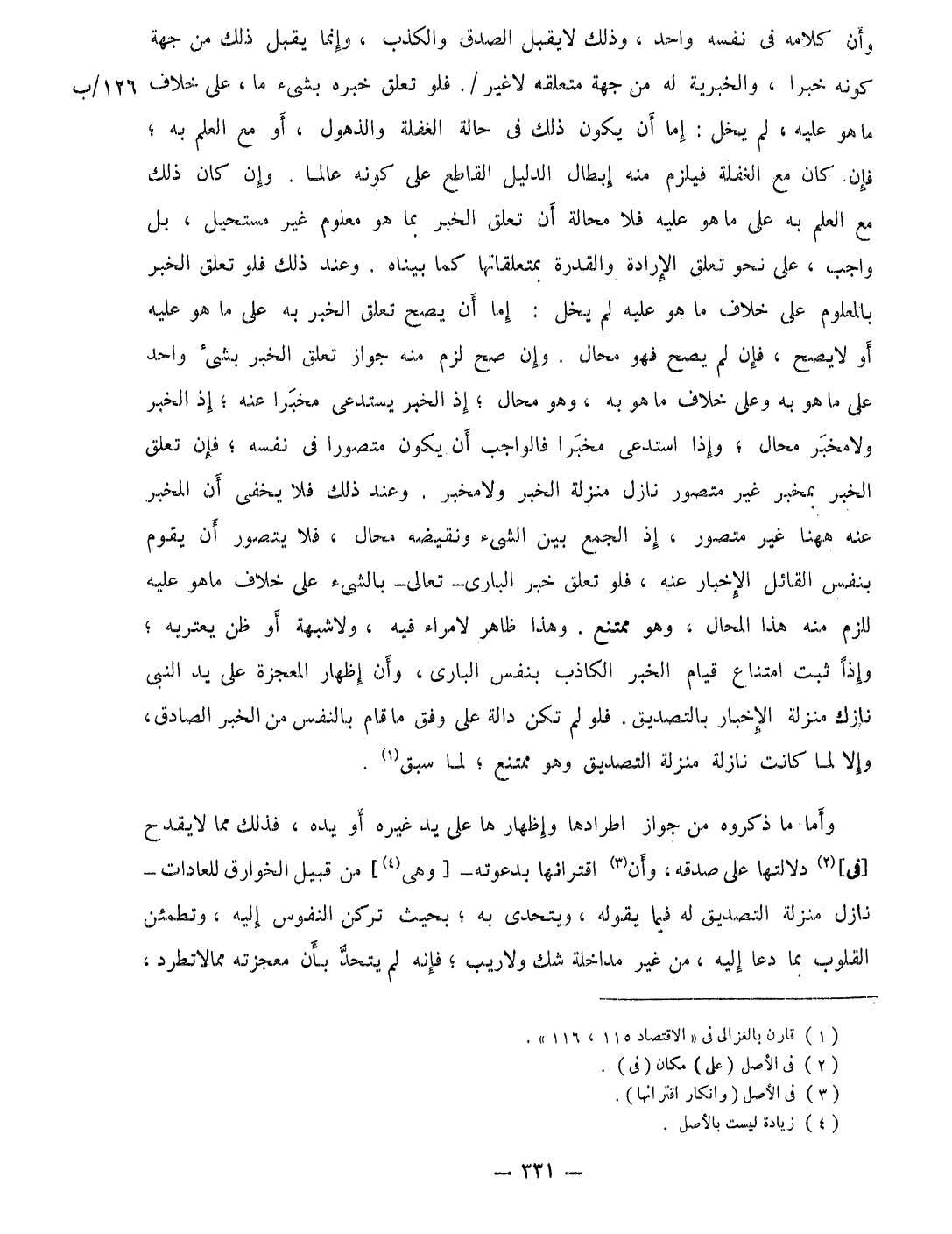 وَأَن كَلَامه فى نَفسه وَاحِد وَذَلِكَ لَا يقبل الصدْق وَالْكذب وَإِنَّمَا يقبل ذَلِك من جِهَة كَونه خَبرا والخبرية لَهُ من جِهَة مُتَعَلّقه لَا غير فَلَو تعلق خَبره بشئ مَا على خلاف مَا هُوَ عَلَيْهِ لم يخل إِمَّا أَن يكون ذَلِك فى حَالَة الْغَفْلَة والذهول أَو مَعَ الْعلم بِهِ فَإِن كَانَ مَعَ الْغَفْلَة فَيلْزم مِنْهُ إبِْطَال الدَّلِيل الْقَاطِع على كَونه عَالما وَإِن كَانَ ذَلِك مَعَ الْعلم بِهِ على مَا هُوَ عَلَيْهِ فَلَا محَالة ان تعلق الْخَبَر بِمَا هُوَ مَعْلُوم غير مُسْتَحِيل بل وَاجِب على نَحْو تعلق الْإِرَادَة وَالْقُدْرَة بمتعلقاتها كَمَا بَيناهُ وَعند ذَلِك فَلَو تعلق الْخَبَر بالمعلوم على خلاف مَا هُوَ عَلَيْهِ لم يخل إِمَّا أَن يَصح تعلق الْخَبَر بِهِ على مَا هُوَ عَلَيْهِ أَو لَا يَصح فَإِن لم يَصح فَهُوَ محَال وَإِن صَحَّ لزم مِنْهُ جَوَاز تعلق الْخَبَر بشئ وَاحِد على مَا هُوَ بِهِ وعَلى خلاف مَا هُوَ بِهِ وَهُوَ محَال إِذْ الْخَبَر يستدعى مخبرا عَنهُ إِذْ الْخَبَر وَلَا مخبر محَال وَإِذا استدعى مخبرا فَالْوَاجِب أَن يكون متصورا فى نَفسه فَإِن تعلق الْخَبَر بمخبر غير مُتَصَوّر نَازل منزلَة الْخَبَر وَلَا مخبر وَعند ذَلِك فَلَا يخفى أَن الْمخبر عَنهُ هَهُنَا غير مُتَصَوّر إِذْ الْجمع بَين الشئ ونقيضه محَال فَلَا يتَصَوَّر أَن يقوم بِنَفس الْقَائِل الْإِخْبَار عَنهُ فَلَو تعلق خبر البارى تَعَالَى بالشئ على خلاف مَا هُوَ عَلَيْهِ للَزِمَ مِنْهُ هَذَا الْمحَال وَهُوَ مُمْتَنع وَهَذَا ظَاهر لَا مراء فِيهِ وَلَا شُبْهَة أَو ظن يَعْتَرِيه وَإِذا ثَبت امْتنَاع قيام الْخَبَر الْكَاذِب بِنَفس البارى وَأَن إِظْهَار المعجزة على يَد النبى نَازل منزلَة الْإِخْبَار بالتصديق فَلَو لم تكن دَالَّة على وفْق مَا قَامَ بِالنَّفسِ من الْخَبَر الصَّادِق وَإِلَّا لما كَانَت نازلة منزلَة التَّصْدِيق وَهُوَ مُمْتَنع لما سبق