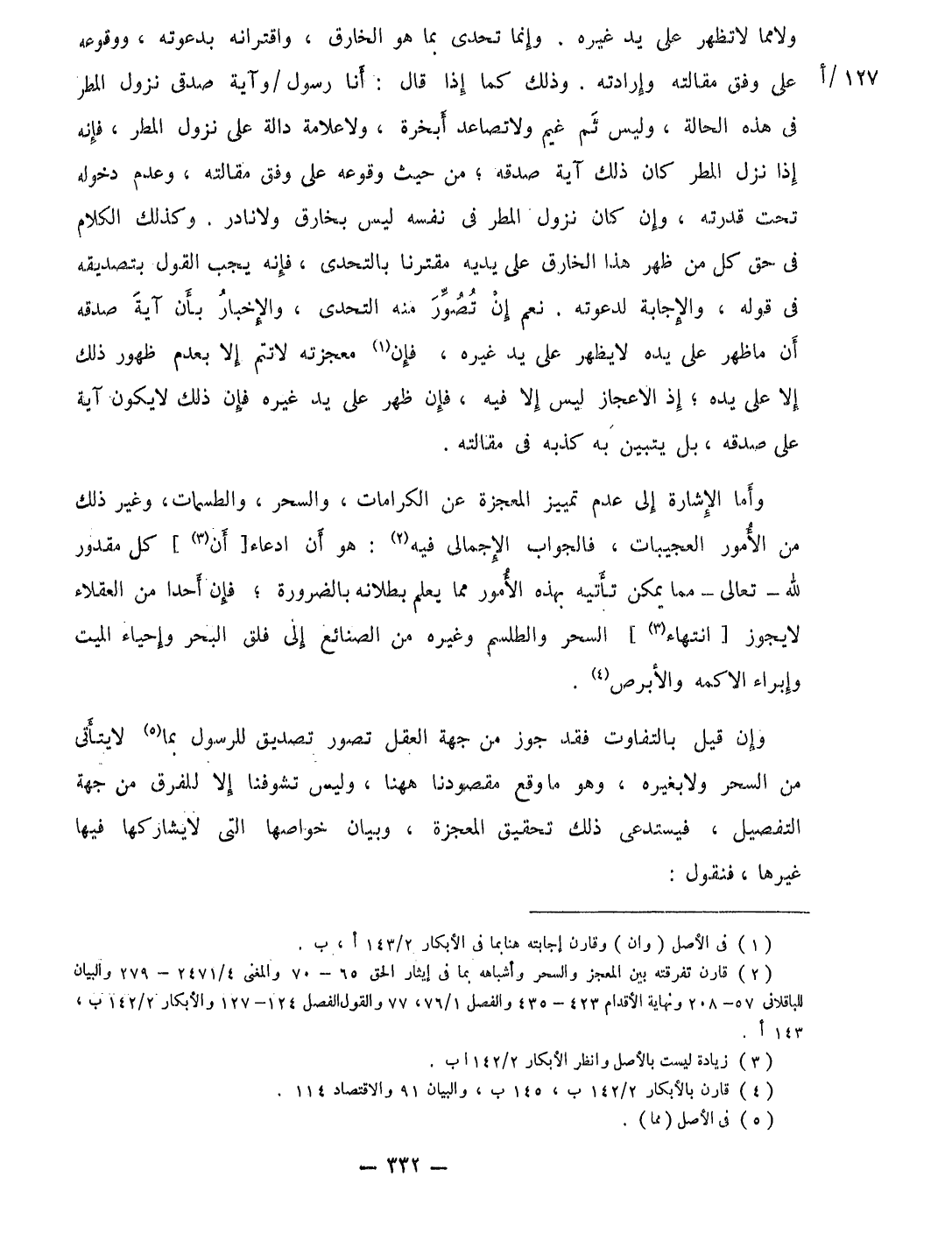 وَلَا مِمَّا لَا تظهر على يَد غَيره وَإِنَّمَا تحدى بِمَا هُوَ الخارق واقترانه بدعوته ووقوعه على وفْق مقَالَته وإرادته وَذَلِكَ كَمَا إِذا قَالَ أَنا رَسُول وَآيَة صدقى نزُول الْمَطَر فى هَذِه الْحَالة وَلَيْسَ ثمَّ غيم وَلَا تصاعد أبخرة وَلَا عَلامَة دَالَّة على نزُول الْمَطَر فَإِنَّهُ إِذا نزل الْمَطَر كَانَ ذَلِك آيَة صدقه من حَيْثُ وُقُوعه على وفْق مقَالَته وَعدم دُخُوله تَحت قدرته وَإِن كَانَ نزُول الْمَطَر فى نَفسه لَيْسَ بخارق وَلَا نَادِر وَكَذَلِكَ الْكَلَام فى حق كل من ظهر هَذَا الخارق على يَدَيْهِ مقترنا بالتحدى فَإِنَّهُ يجب القَوْل بتصديقه فِي قَوْله والأجابة لدعوته نعم ان تصور مِنْهُ التحدى والإخبار بِأَن آيَة صدقه أَن مَا ظهر على يَده لَا يظْهر على يَد غَيره فَإِن معجزته لَا تتمّ إِلَّا بِعَدَمِ ظُهُور ذَلِك إِلَّا على يَده إِذْ الإعجاز لَيْسَ إِلَّا فِيهِ فَإِن ظهر على يَد غَيره فَإِن ذَلِكُم لَا يكون آيَة على صدقه بل يتَبَيَّن بِهِ كذبه فى مقَالَته