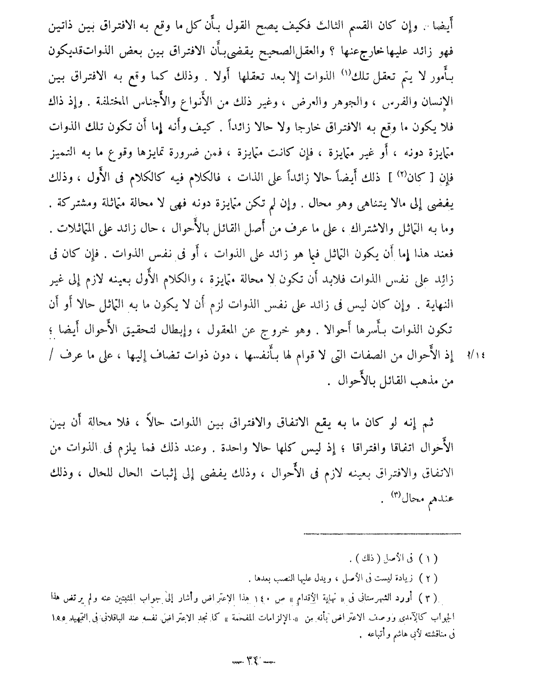 أَيْضا وَإِن كَانَ الْقسم الثَّالِث فَكيف يَصح القَوْل بِأَن كل مَا وَقع بِهِ الِافْتِرَاق بَين ذاتين فَهُوَ زَائِد عَلَيْهَا خَارج عَنْهَا وَالْعقل الصَّحِيح يقْضى بَان الِافْتِرَاق بَين بعض الذوات قد يكون بِأُمُور لَا يتم تعقل تِلْكَ الذوات إِلَّا بعد تعقلها أَولا وَذَلِكَ كَمَا وَقع بِهِ الِافْتِرَاق بَين الْإِنْسَان وَالْفرس والجوهر وَالْعرض وَغير ذَلِك من الانواع والأجناس الْمُخْتَلفَة وَإِذ ذَاك فَلَا يكون مَا وَقع بِهِ الِافْتِرَاق خَارِجا وَلَا حَالا زَائِدا كَيفَ وَأَنه إِمَّا أَن تكون تِلْكَ الذوات متمايزة دونه أَو غير متمايزة فَإِن كَانَت متمايزة فَمن ضَرُورَة تمايزها وُقُوع مَا بِهِ التميز فَإِن كَانَ ذَلِك أَيْضا حَالا زَائِدا على الذَّات فَالْكَلَام فِيهِ كَالْكَلَامِ فِي الأول وَذَلِكَ يفضى إِلَى مَا لَا يتناهى وَهُوَ محَال وَإِن لم تكن متمايزة دونه فهى لَا محَالة متماثلة ومشتركة وَمَا بِهِ التَّمَاثُل والاشتراك على مَا عرف من اصل الْقَائِل بالأحوال حَال زَائِد على المتماثلات فَعِنْدَ هَذَا إِمَّا أَن يكون التَّمَاثُل فِيمَا هُوَ زَائِد على الذوات أَو فِي نفس الذوات فَإِن كَانَ فِي زَائِد على نفس الذوات فَلَا بُد أَن تكون لَا محَالة متمايزة وَالْكَلَام الاول بِعَيْنِه لَازم إِلَى غير النِّهَايَة وَإِن كَانَ لَيْسَ فِي زَائِد على نفس الذوات لزم أَن لَا يكون مَا بِهِ التَّمَاثُل حَالا أَو أَن تكون الذوات بأسرها أحوالا وَهُوَ خُرُوج عَن الْمَعْقُول وَإِبْطَال لتحقيق الْأَحْوَال أَيْضا إِذْ الْأَحْوَال من الصِّفَات الَّتِي لَا قوام لَهَا بأنفسها دون ذَوَات تُضَاف إِلَيْهَا على مَا عرف من مَذْهَب الْقَائِل بالأحوال