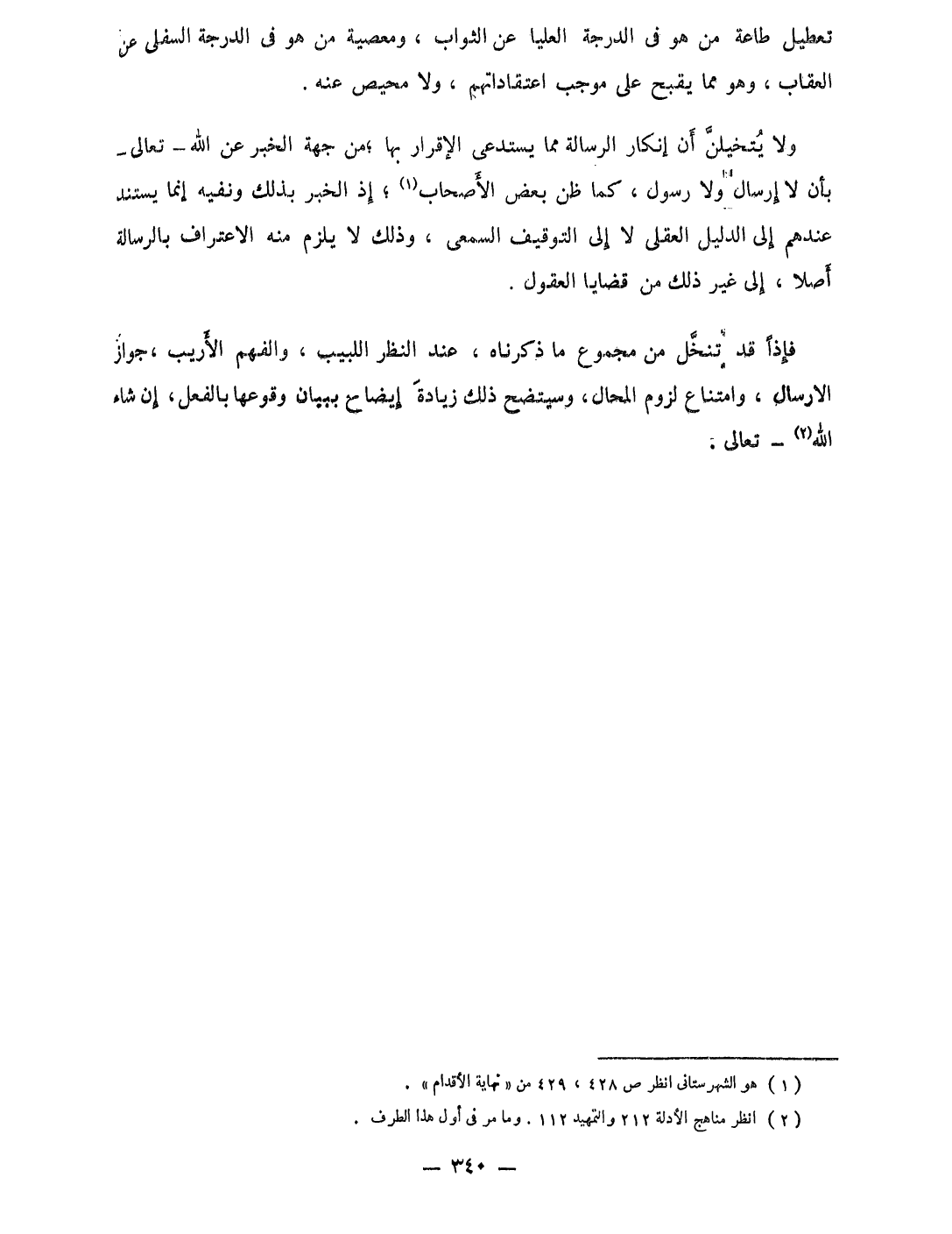 فَإِذا قد تنخل من مَجْمُوع مَا ذَكرْنَاهُ عِنْد النّظر اللبيب والفهم الأريب جَوَاز الارسال وَامْتِنَاع لُزُوم الْمحَال وسيتضح ذَلِك زِيَادَة إِيضَاح بِبَيَان وُقُوعهَا بِالْفِعْلِ إِن شَاءَ الله تَعَالَى
