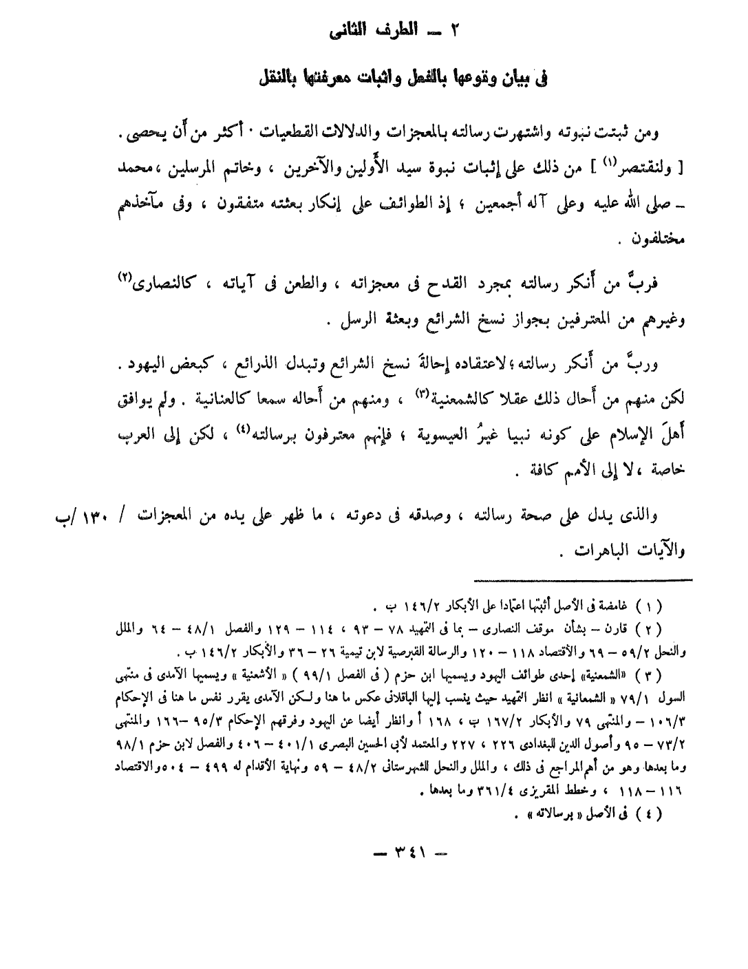 وَمن ثبتَتْ نبوته واشتهرت رسَالَته بالمعجزات والدلالات القطعيات أَكثر من أَن يُحْصى ولنقتصر من ذَلِك على إِثْبَات نبوة سيد الْأَوَّلين والآخرين وَخَاتم الْمُرْسلين مُحَمَّد صلى الله عَلَيْهِ وعَلى آله اجمعين إِذْ الطوائف على إِنْكَار بعثته متفقون وفى مآخذهم مُخْتَلفُونَ