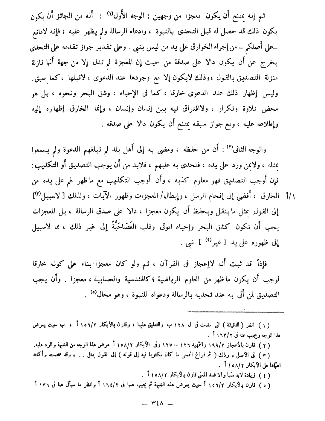 ثمَّ إِنَّه يمْتَنع أَن يكون معجزا من وَجْهَيْن الْوَجْه الأول أَنه من الْجَائِز أَن يكون ذَلِك قد حصل لَهُ قبل التحدى بِالنُّبُوَّةِ وادعاء الرسَالَة وَلم يظْهر عَلَيْهِ فَإِنَّهُ لَا مَانع على أصلكم من إِجْرَاء الخوارق على يَد من لَيْسَ بنبى وعَلى تَقْدِير جَوَاز تقدمه على التحدى يخرج عَن أَن يكون دَالا على صدقه من حَيْثُ إِن المعجزة لم تدل إِلَّا من جِهَة أَنَّهَا نازلة منزلَة التَّصْدِيق بالْقَوْل وَذَلِكَ لَا يكون إِلَّا مَعَ وجودهَا عِنْد الدَّعْوَى لَا قبلهَا كَمَا سبق وَلَيْسَ إِظْهَار ذَلِك عِنْد الدَّعْوَى خارقا كَمَا فى الْإِحْيَاء وشق الْبَحْر وَنَحْوه بل هُوَ مَحْض تِلَاوَة وتكرار وَلَا افْتِرَاق فِيهِ بَين إِنْسَان وإنسان وَإِنَّمَا الخارق إِظْهَاره إِلَيْهِ وإطلاعه عَلَيْهِ وَمَعَ جَوَاز سبقه يمْتَنع أَن يكون دَالا على صدقه