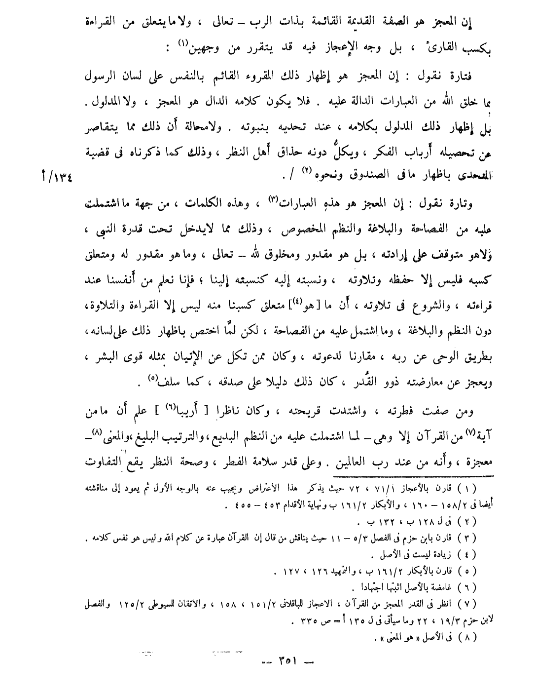 إِن المعجز هُوَ الصّفة الْقَدِيمَة الْقَائِمَة بِذَات الرب تَعَالَى وَلَا مَا يتَعَلَّق من الْقِرَاءَة بكسب الْقَارئ بل وَجه الإعجاز فِيهِ قد يَتَقَرَّر من وَجْهَيْن