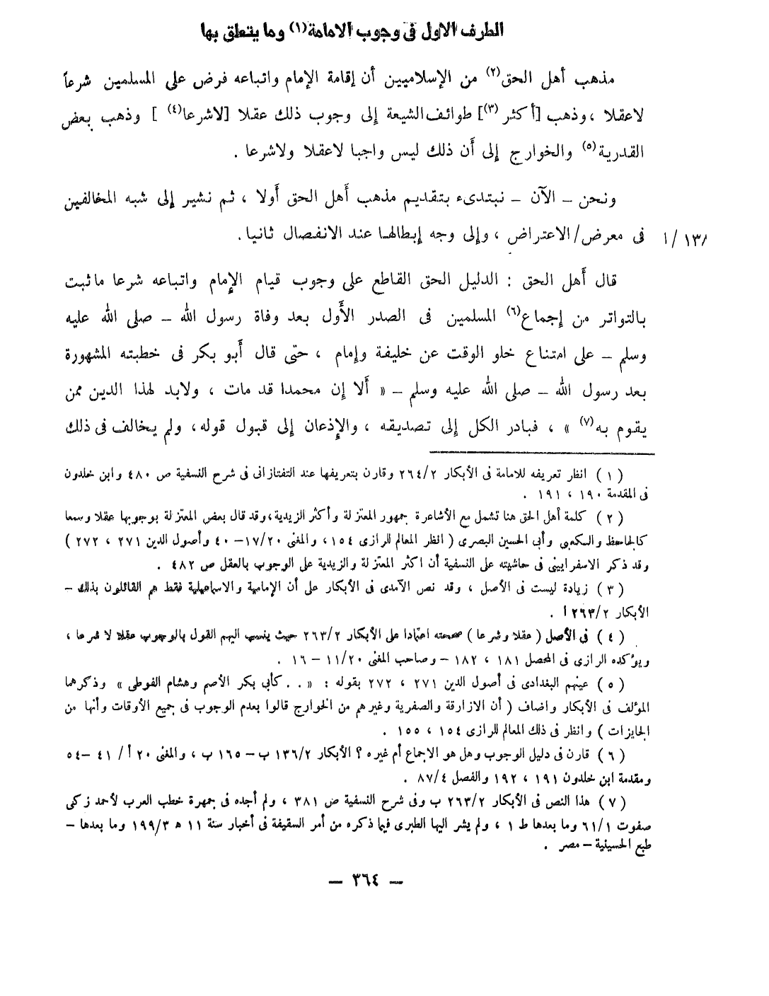 قَالَ أهل الْحق الدَّلِيل الْقَاطِع على وجوب قيام الإِمَام واتبعاه شرعا مَا ثَبت بالتواتر من إِجْمَاع الْمُسلمين فى الصَّدْر الأول بعد وَفَاة رَسُول الله صلى الله عَلَيْهِ وَسلم على امْتنَاع خلو الْوَقْت عَن خَليفَة وَإِمَام حَتَّى قَالَ أَبُو بكر فى خطبَته الْمَشْهُورَة بعد رَسُول الله صلى الله عَلَيْهِ وَسلم أَلا إِن مُحَمَّدًا قد مَاتَ وَلَا بُد لهَذَا الدّين مِمَّن يقوم بِهِ فبادر الْكل إِلَى تَصْدِيقه والإذغان إِلَى قبُول قَوْله وَلم يُخَالف فى ذَلِك