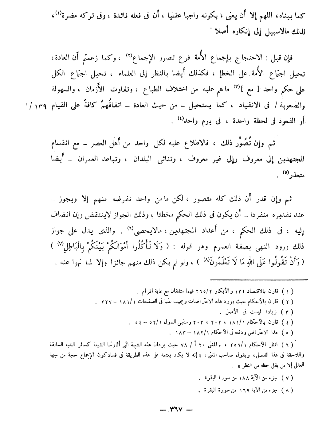ثمَّ وَإِن قدر أَن ذَلِك كُله مُتَصَوّر لَكِن مَا من وَاحِد نفرضه مِنْهُم إِلَّا وَيجوز عِنْد تَقْدِيره مُنْفَردا أَن يكون فى ذَلِك الحكم مخطئا وَذَلِكَ الْجَوَاز لَا ينْتَقض وَإِن انضاف إِلَيْهِ فى ذَلِك الحكم من أعداد الْمُجْتَهدين مَا لَا يُحْصى والذى يدل على جَوَاز ذَلِك وُرُود النهى بِصفة الْعُمُوم وَهُوَ قَوْله {وَلَا تَأْكُلُوا أَمْوَالكُم بَيْنكُم بِالْبَاطِلِ} {وَأَن تَقولُوا على الله مَا لَا تعلمُونَ} وَلم لم يكن ذَلِك مِنْهُم جَائِزا وَإِلَّا لما نهوا عَنهُ