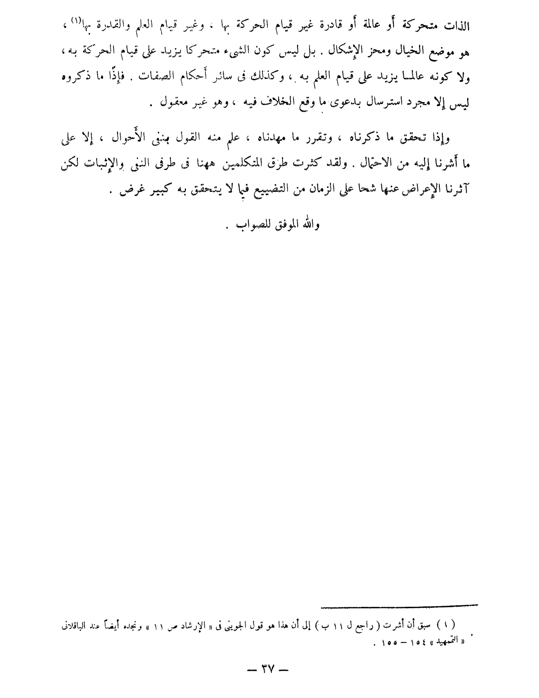 الذَّات متحركة أَو عَالِمَة اَوْ قادرة غير قيام الْحَرَكَة بهَا الْعلم وَالْقُدْرَة بهَا هُوَ مَوضِع الخيال ومحز الْإِشْكَال بل لَيْسَ كَون الشئ متحركا يزِيد على قيام الْحَرَكَة بِهِ وَلَا كَونه عَالما يزِيد على قيام الْعلم بِهِ وَكَذَلِكَ فِي سَائِر إحكام الصِّفَات فَإِذا مَا ذَكرُوهُ لَيْسَ إِلَّا مُجَرّد استرسال بِدَعْوَى مَا وَقع الْخلاف فِيهِ وَهُوَ غير مَعْقُول