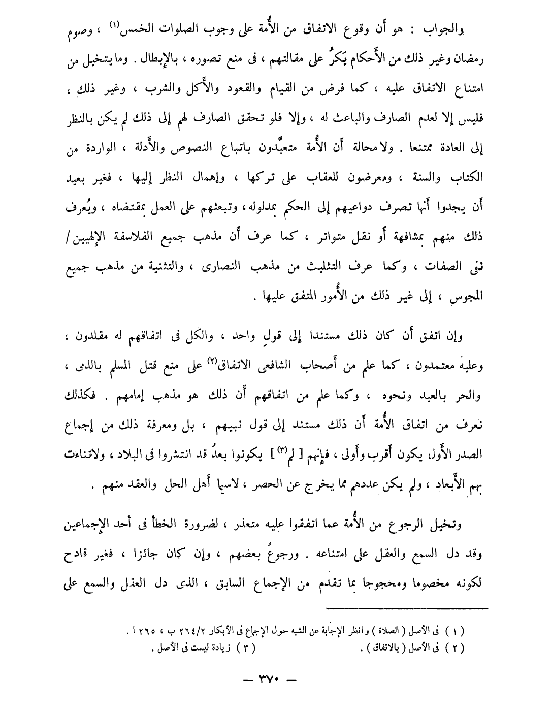 وَالْجَوَاب هُوَ أَن وُقُوع الِاتِّفَاق من الْأمة على وجوب الصَّلَوَات الْخمس وَصَوْم رَمَضَان وَغير ذَلِك من الْأَحْكَام يكر على مقالتهم فى منع تصَوره بالإبطال وَمَا يتخيل من امْتنَاع الِاتِّفَاق عَلَيْهِ كَمَا فرض من الْقيام وَالْقعُود وَالْأكل وَالشرب وَغير ذَلِك فَلَيْسَ إِلَّا لعدم الصَّارِف والباعث لَهُ وَإِلَّا فَلَو تحقق الصَّارِف لَهُم إِلَى ذَلِك لم يكن بِالنّظرِ إِلَى الْعَادة مُمْتَنعا وَلَا محَالة أَن الْأمة متعبدون بِاتِّبَاع النُّصُوص والأدلة الورادة من الْكتاب وَالسّنة ومعرضون للعقاب على تَركهَا وإهمال النّظر إِلَيْهَا فَغير بعيد أَن يَجدوا أَنَّهَا تصرف دواعيهم إِلَى الحكم بمدلوله وتبعثهم على الْعَمَل بِمُقْتَضَاهُ وَيعرف ذَلِك مِنْهُم بمشافهة أَو نقل متواتر كَمَا عرف أَن مَذْهَب جَمِيع الفلاسفة الإلهيين نفى الصِّفَات وكما عرف التَّثْلِيث من مَذْهَب النَّصَارَى والتثنية من مَذْهَب جَمِيع الْمَجُوس إِلَى غير ذَلِك من الْأُمُور الْمُتَّفق عَلَيْهَا