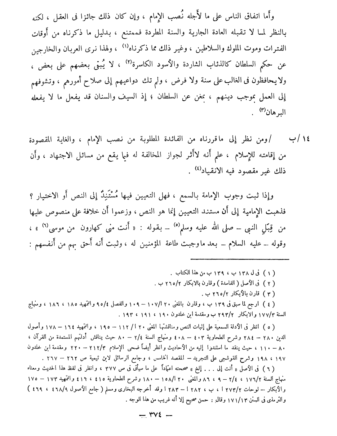 وَإِذا ثَبت وجوب الْإِمَامَة بِالسَّمْعِ فَهَل التَّعْيِين فِيهَا مُسْتَند إِلَى النَّص أَو الِاخْتِيَار فَذَهَبت الإمامية إِلَى أَن مُسْتَند التَّعْيِين إِنَّمَا هُوَ النَّص وَزَعَمُوا أَن خلَافَة على مَنْصُوص علها من قبل النبى صلى الله عَلَيْهِ وَسلم بقوله أَنْت منى كهارون من مُوسَى وَقَوله عَلَيْهِ السَّلَام بعد مَا وَجَبت طَاعَة الْمُؤمنِينَ لَهُ وَثَبت أَنه أَحَق بهم من أنفسهم