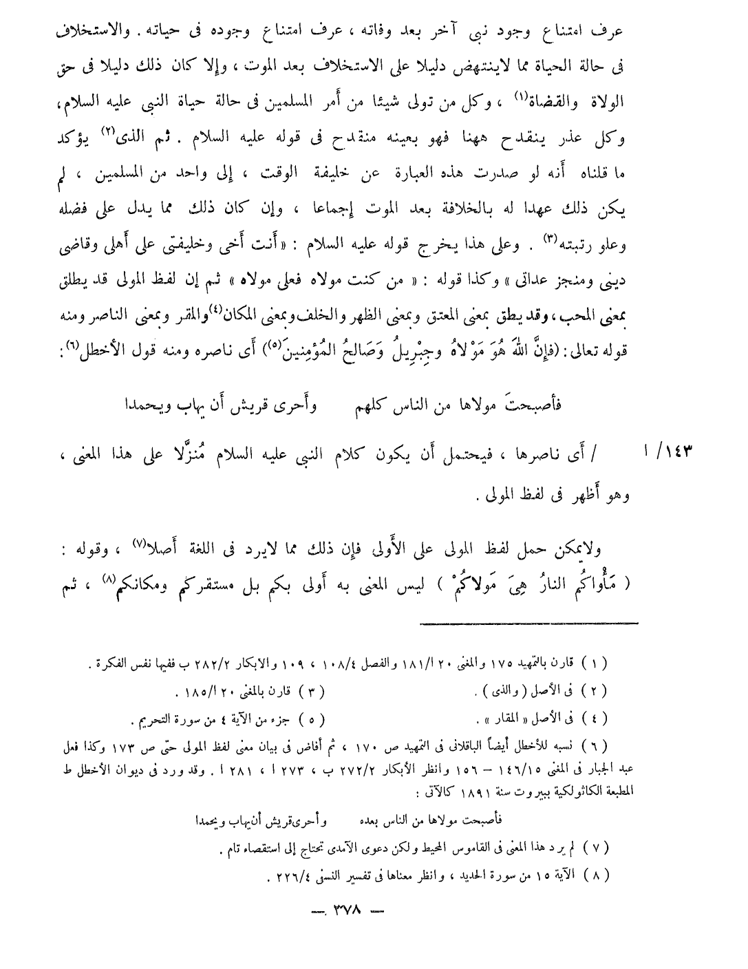 عرف امْتنَاع وجود نبى آخر بعد وَفَاته عرف امْتنَاع وجوده فى حَيَاته والاستخلاف فى حَالَة الْحَيَاة مِمَّا لَا ينتهض دَلِيلا على الِاسْتِخْلَاف بعد الْمَوْت وَإِلَّا كَانَ ذَلِك دَلِيلا فى حق الْوُلَاة والقضاة وكل من تولى شَيْئا من أَمر الْمُسلمين فى حَالَة حَيَاة النبى عَلَيْهِ السَّلَام وكل عذر ينقدح هَهُنَا فَهُوَ بِعَيْنِه منقدح فى قَوْله عَلَيْهِ السَّلَام ثمَّ الذى يُؤَكد مَا قُلْنَاهُ أَنه لَو صدرت هَذَا الْعبارَة عَن خَليفَة الْوَقْت إِلَى وَاحِد من الْمُسلمين لم يكن ذَلِك عهدا لَهُ بالخلافة بعد الْمَوْت إِجْمَاعًا وَإِن كَانَ ذَلِك مِمَّا يدل على فَضله وعلو رتبته وعَلى هَذَا يخرج قَوْله عَلَيْهِ السَّلَام أَنْت أخى وخليفتى على أهلى وقاضى دينى ومنجز عداتى وَكَذَا قَوْله من كنت مَوْلَاهُ فعلى مَوْلَاهُ ثمَّ إِن لفظ الْمولى قد يُطلق بِمَعْنى الْمُحب وَقد يُطلق بِمَعْنى الْمُعْتق وَبِمَعْنى الظّهْر وَالْخلف وَبِمَعْنى الْمَكَان وَالْمقر وَبِمَعْنى النَّاصِر وَمِنْه قَوْله تَعَالَى {فَإِن الله هُوَ مَوْلَاهُ وَجِبْرِيل وَصَالح الْمُؤمنِينَ} أى ناصره وَمِنْه قَول الأخطل ... فَأَصْبَحت مَوْلَاهُ من النَّاس كلهم ... وَأَحْرَى قُرَيْش أَن يهاب ويحمدا ...