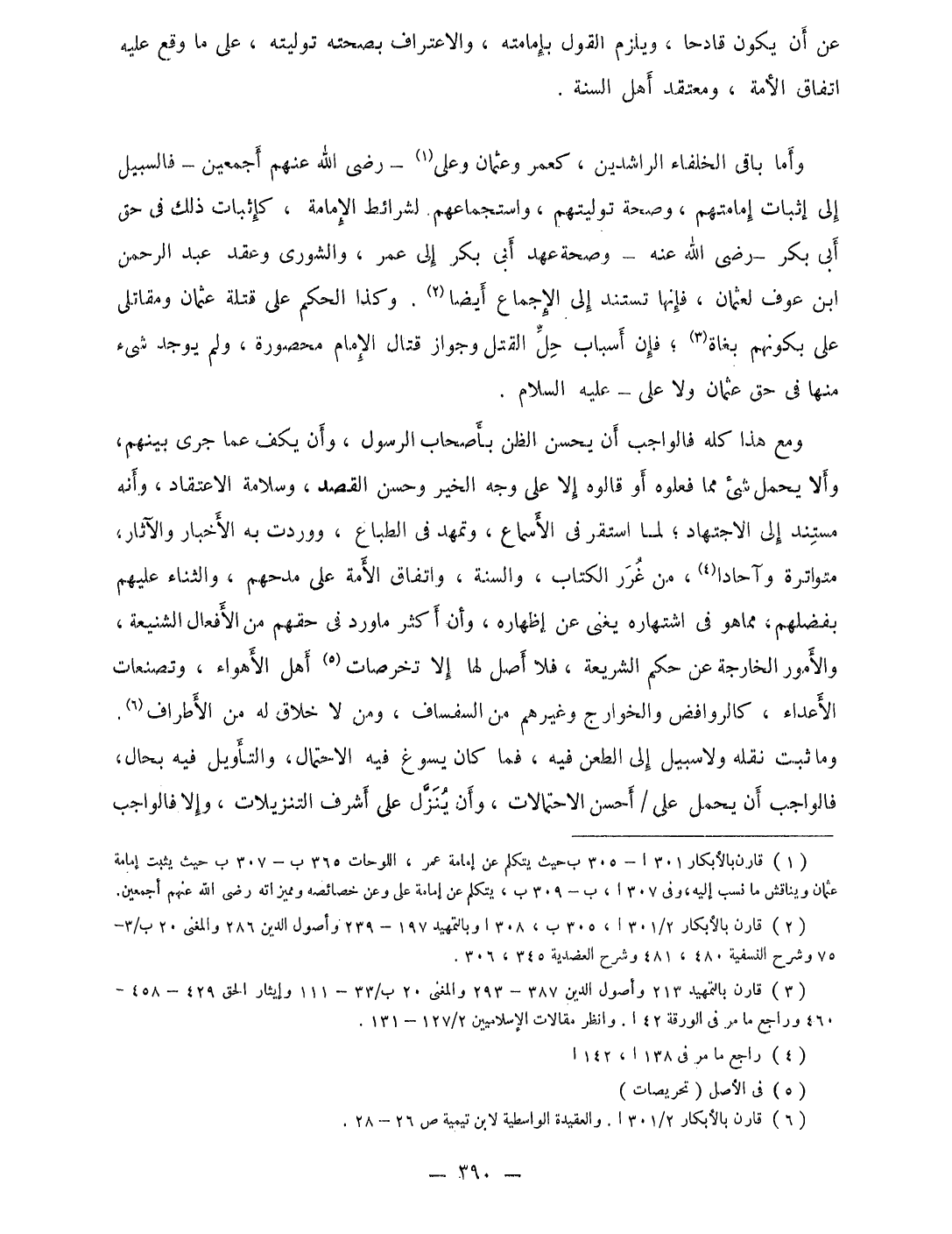 وَأما باقى الْخُلَفَاء الرَّاشِدين كعمر وَعُثْمَان وعَلى رضى الله عَنْهُم أَجْمَعِينَ فالسبيل إِلَى إِثْبَات إمامتهم وَصِحَّة توليتهم واستجماعهم لشرائط الْإِمَامَة كإثبات ذَلِك فى حق أَبى بكر رضى الله عَنهُ وَصِحَّة عهد أَبى بكر إِلَى عمر والشورى وَعقد عبد الرَّحْمَن ابْن عَوْف لعُثْمَان فَإِنَّهَا تستند إِلَى الْإِجْمَاع أَيْضا وَكَذَا الحكم على قتلة عُثْمَان ومقاتلى على بكونهم بغاة فَإِن أَسبَاب حل الْقَتْل وَجَوَاز قتال الإِمَام محصورة وَلم يُوجد شئ مِنْهَا قى حق عُثْمَان وَلَا على عَلَيْهِ السَّلَام