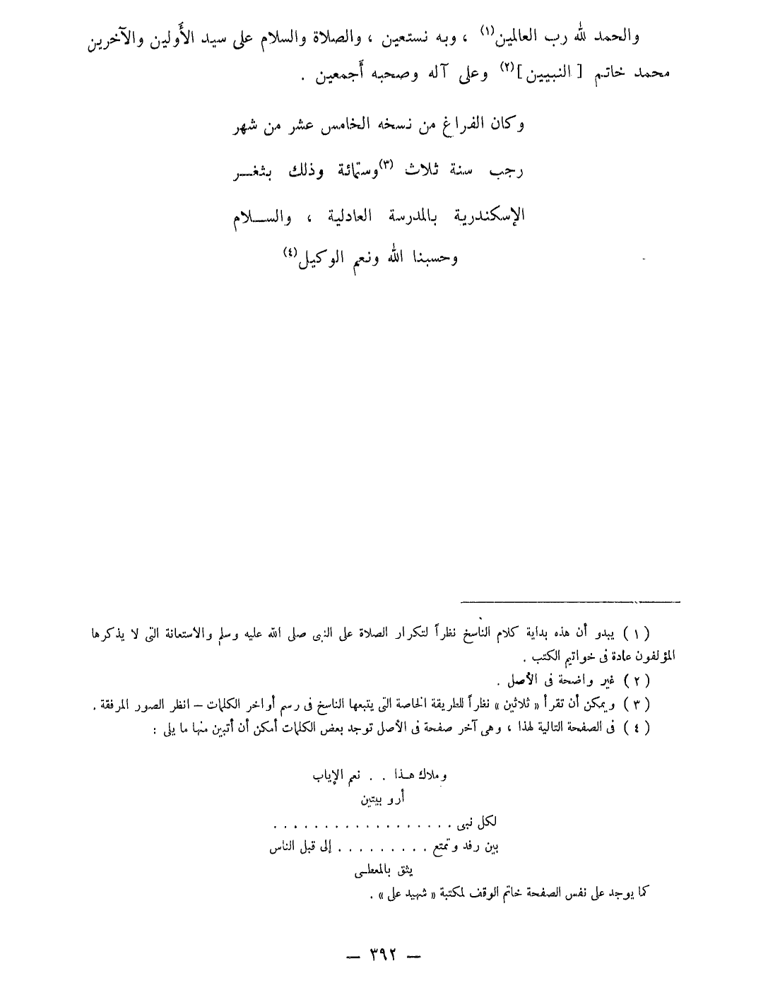 وَالْحَمْد لله رب الْعَالمين وَبِه نستعين وَالصَّلَاة وَالسَّلَام على سيد الْأَوَّلين والآخرين مُحَمَّد خَاتم النَّبِيين وعَلى آله وَصَحبه أَجْمَعِينَ وَكَانَ الْفَرَاغ من نسخه الْخَامِس عشر من شهر رَجَب سنة ثَلَاث وسِتمِائَة وَذَلِكَ بثغر الْإسْكَنْدَريَّة بِالْمَدْرَسَةِ العادلية وَالسَّلَام وحسبنا الله وَنعم الْوَكِيل